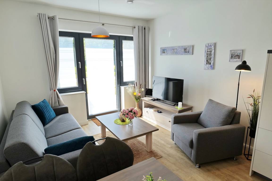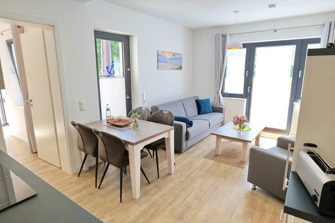 Das schicke 2-Zimmer-Appartement bietet Ihnen mit einer geräumigen Wohnfläche von ca.58m² beste Voraussetzungen für einen entspannten Urlaub und verwöhnt zudem mit einer ca.37,95m² großen Terrasse mit seitlichem Meerblick. Die Wohnung ist für eine Belegung mit maximal 3 Personen ausgestattet. Der attraktiv eingerichtete Wohn-/Essbereich empfängt Sie hochwertig möbliert.