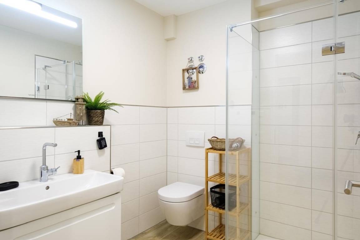 Das moderne Duschbad verfügt über einen Handtuchheizkörper und eine Fußbodenheizung, die für zusätzlichen Komfort sorgen. Hier können Sie sich richtig wohlfühlen.
