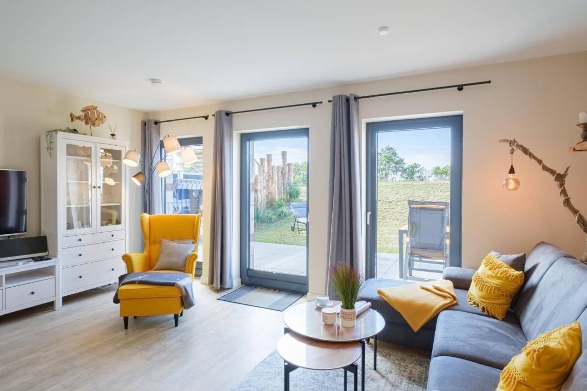 Das geräumige und helle Wohnzimmer mit offener Küche lässt keine Wünsche offen. Hier finden Sie eine große Schlafcouch, die Platz für eine dritte Person bietet, einen Esstisch mit gemütlichem Küchensofa, einen Fernsehsessel sowie einen großen TV und eine Hifi-Anlage. Für gesellige Abende stehen Ihnen verschiedene Gesellschaftsspiele zur Verfügung.