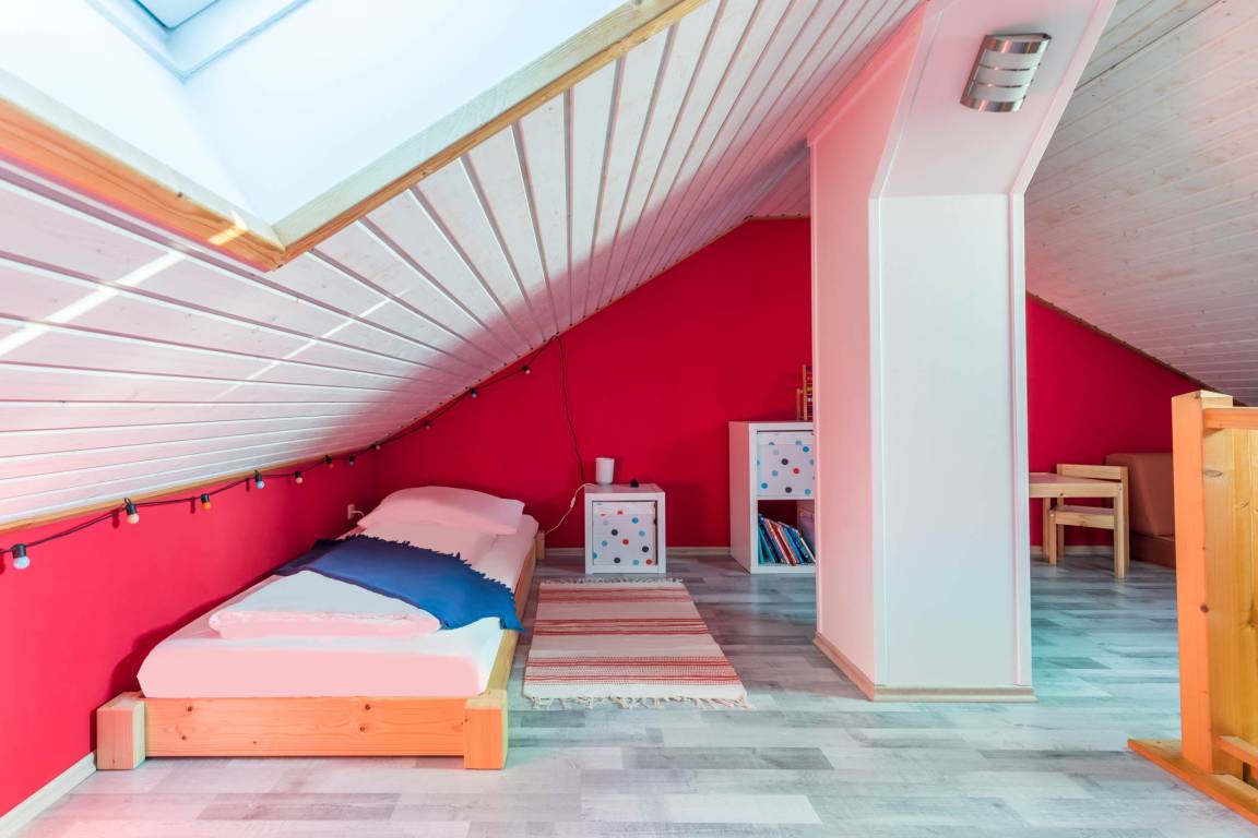 Vom Wohnbereich aus gelangen Sie über eine Raumspartreppe ins offene Dachgeschoss. Hier stehen 2 flache Einzelbetten bereit. Ein eigener Flatscreen-TV an der Wand sorgt auch auf dieser Etage für Unterhaltung. Eine kleine Chill-Ecke mit niedriger Couch, Tisch, Stühlen und Spielzeug lädt zum Relaxen, Lesen und Spielen ein.