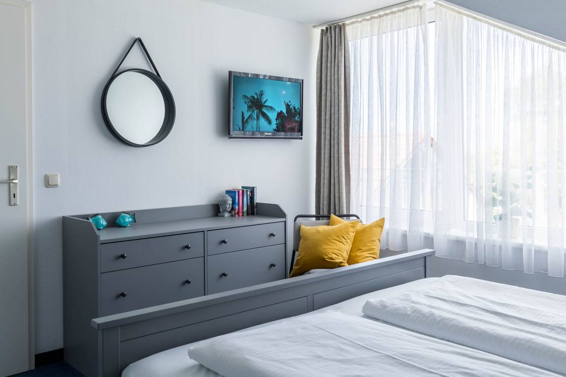 Das Schlafzimmer ist mit einem Doppelbett ausgestattet. Im Kleiderschrank und der Kommode können Sie Ihre Urlaubsgarderobe unterbringen. Eine Baby-Beistellbett finden Sie, falls benötigt, im Flurschrank. Zusätzliches Bettzeug ist auch vorhanden.