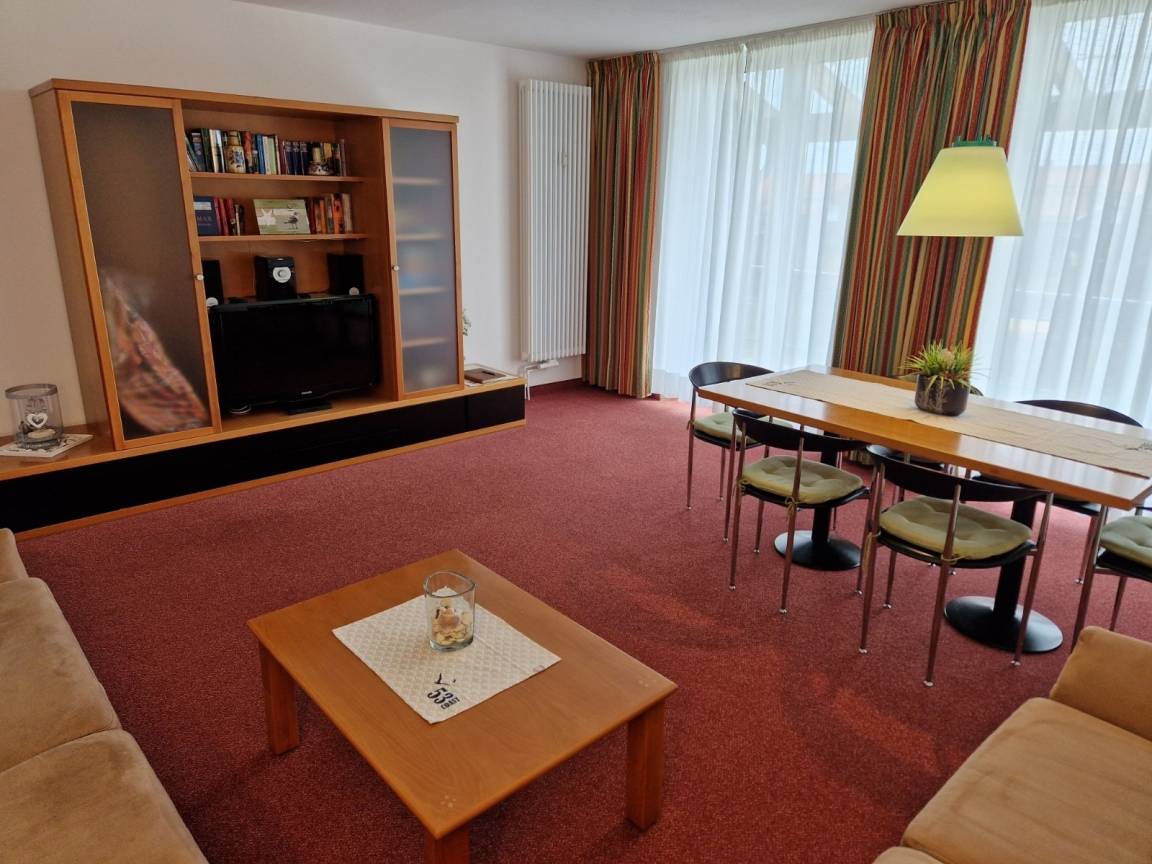 - Wohnzimmer mit Doppelschlafcouch, Essbereich für 6 Personen, Anbauwand mit TV + Musikanlage