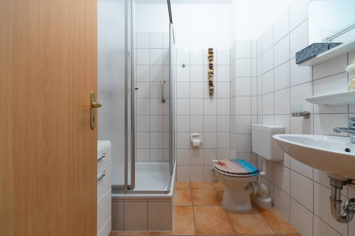 - Badezimmer mit Dusche, WC, Spiegel, Fön