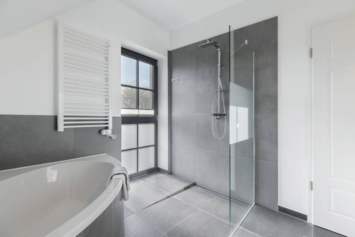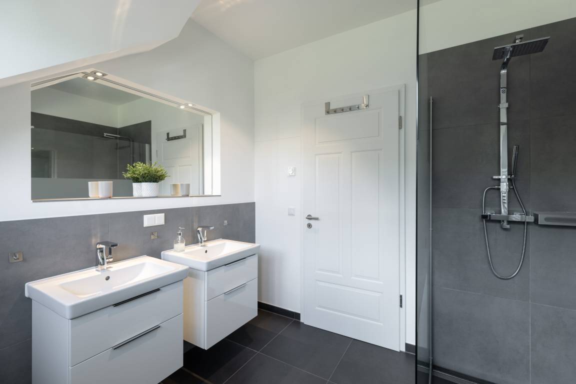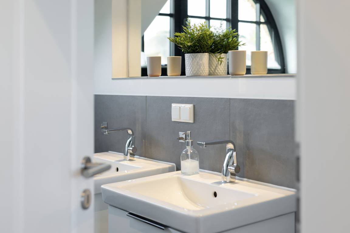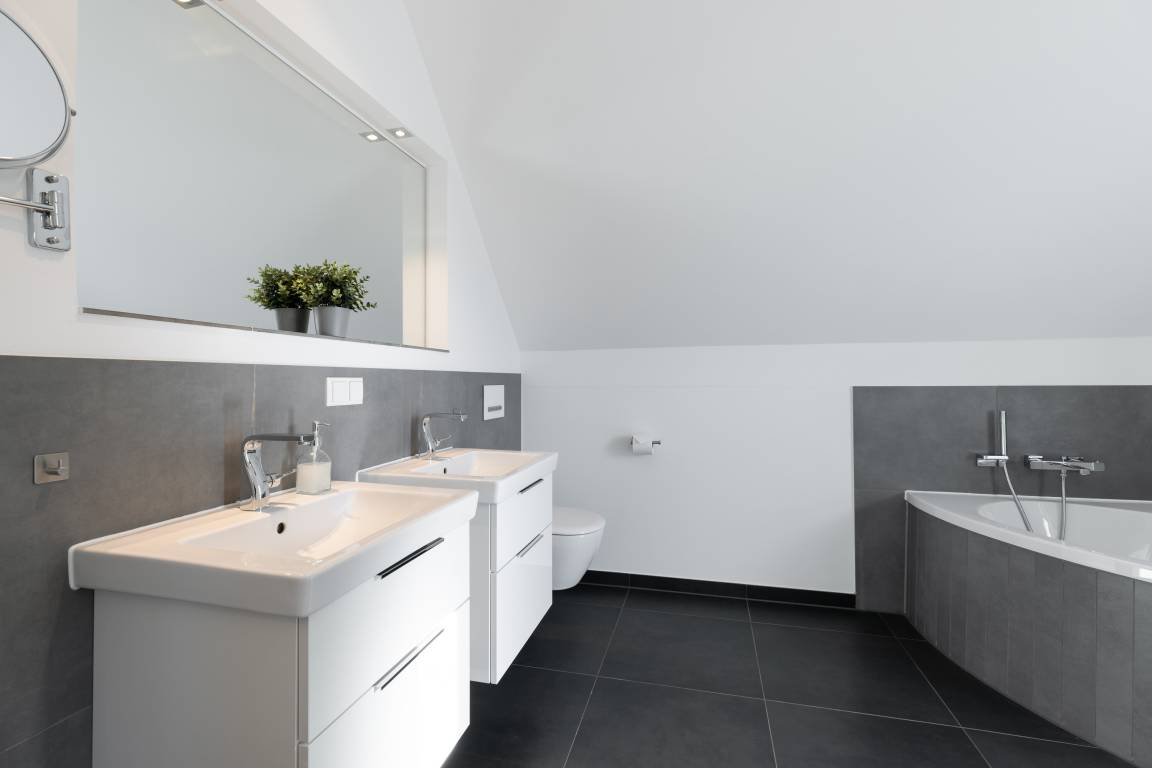 Die Bade-Lounge ist direkt vom großen Schlafzimmer aus zu begehen und bietet mit Badewanne, WC und zwei Waschbecken alle Annehmlichkeiten. Ein zusätzliches Bad mit Dusche, WC und zwei Waschbecken lässt auch bei voller Belegung des Hauses keine Engpässe entstehen.