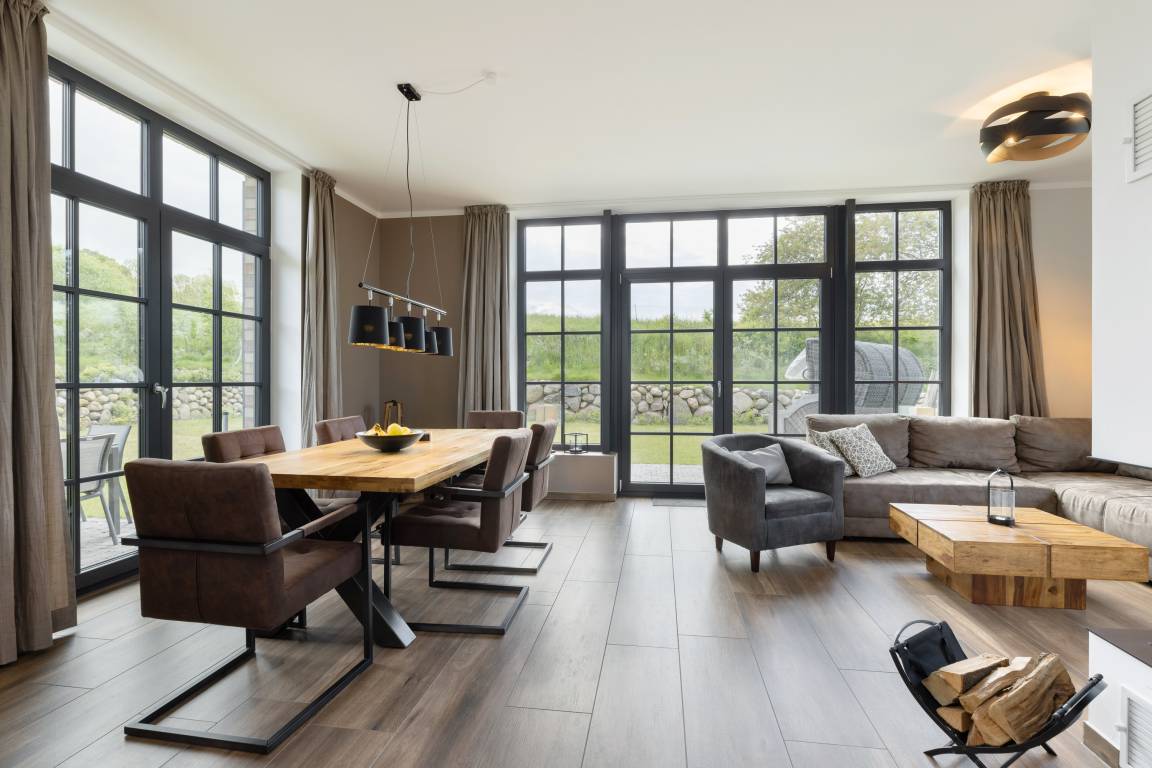 Die moderne, großzügige Küche ist offen angelegt und mit allem ausgestattet, was man benötigt, um nicht nur den schnellen Snack für zwischendurch, sondern auch das Mehrgangmenü am Abend zubereiten zu können. Großzügige Fensterfronten, ein komfortabler Esstisch und eine gemütliche Sitzgruppe vor dem Kamin prägen den lichtdurchfluteten Wohnbereich. Und was gibt es Schöneres an kühlen Abenden, als das Flackern von brennenden Holzscheiten im Kamin! Wer die raue Schönheit der Küste in Herbst und Winter liebt, weiß die Wärme und Behaglichkeit eines Kaminfeuers zu schätzen. Denken Sie daher bei Ihrer Buchung am besten gleich daran, Kaminholz für den ersten Abend zu bestellen.