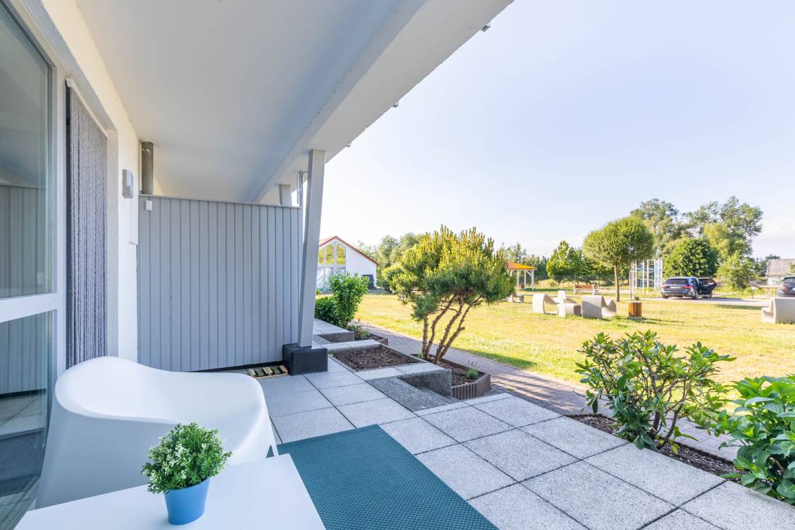 Genießen Sie die Aussichten auf beiden möblierten Terrassen: vom Wohnzimmer aus begehen Sie die Nord-Terrasse zur Ostsee, vom Schlafzimmer begehen Sie die Südterrasse mit Blick ins Grüne.