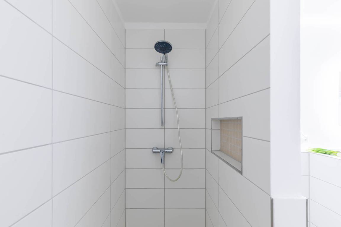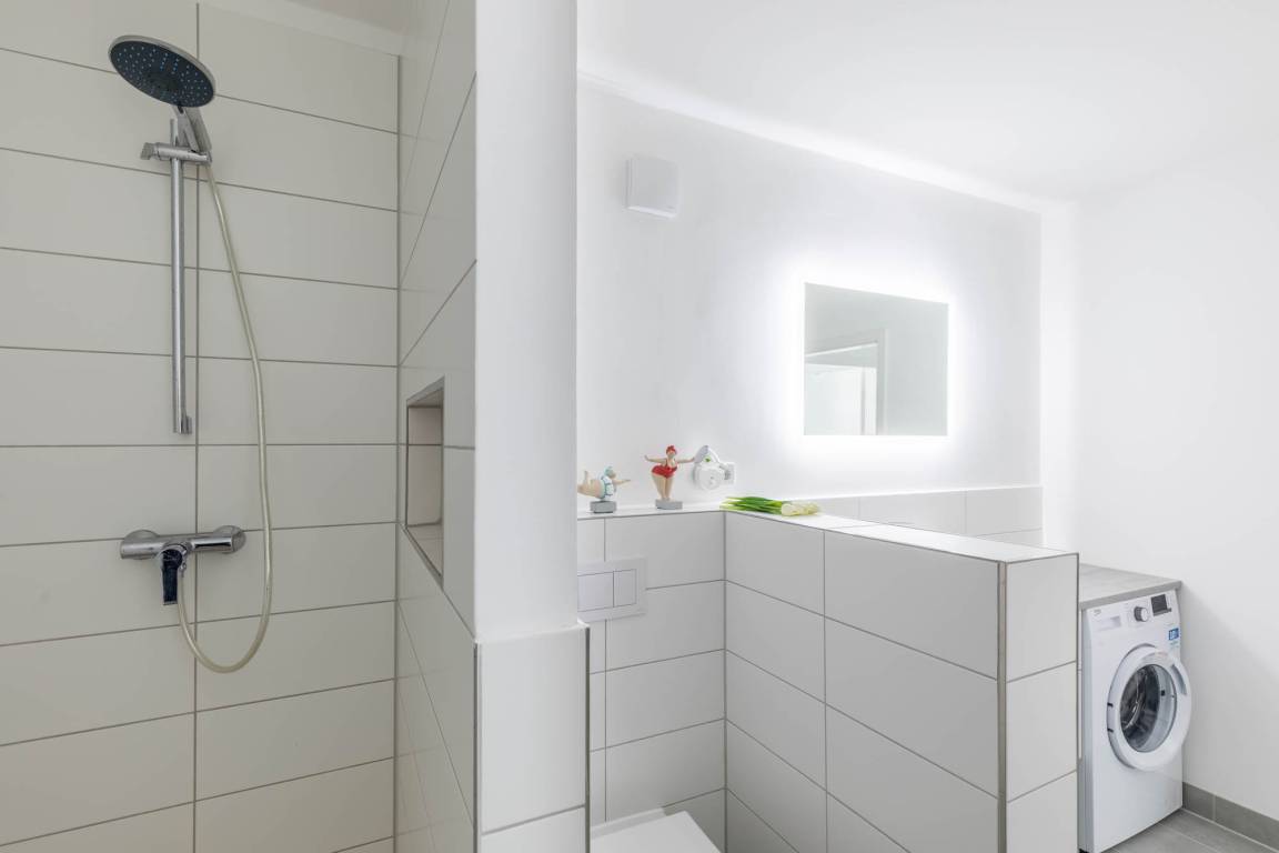 Das hell geflieste Bad ist mit Dusche und WC ausgestattet, auch eine Waschmaschine befindet sich hier.