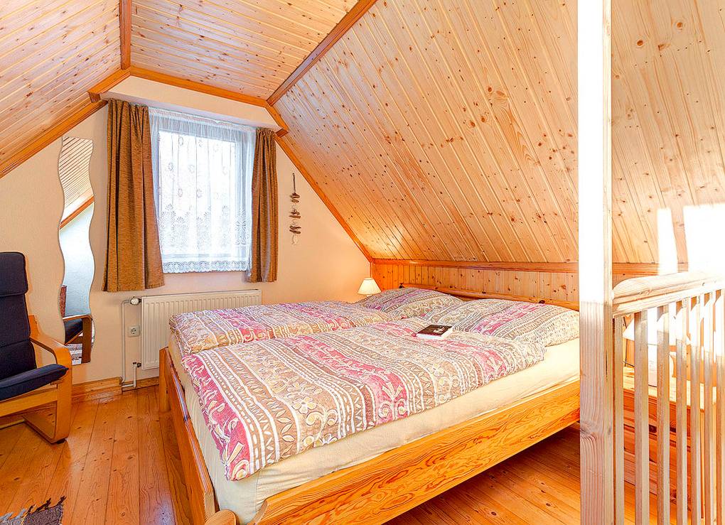 D 139.24 Ferienhaus 2-4 Pers.: 2 ½-Zimmer-Haus mit 60 qm Wohnfläche über 2 Etagen. Parterre: Wohnraum mit Sitzgruppe am Kamin, Sat-TV. Küchen-/Essraum mit Esstisch (4 Pers.), Radio/CD, neuer Küchenzeile (Backofen, Mikrowelle). Bad/WC. Vom Wohnraum Treppe in die 1. Etage (Dachschrägen): Schöner Schlafbereich auf offener Galerie (Doppelbett). 2-Bettzimmer, wenig Stauraum.