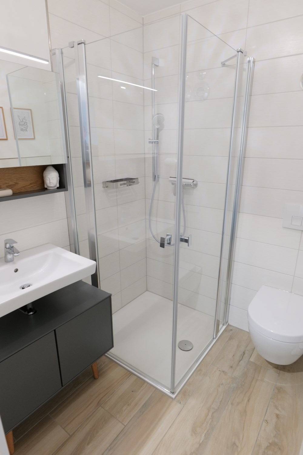 - Badezimmer mit Dusche/WC, Waschbecken und Spiegelschrank, ua. Fön