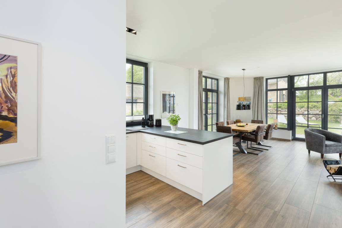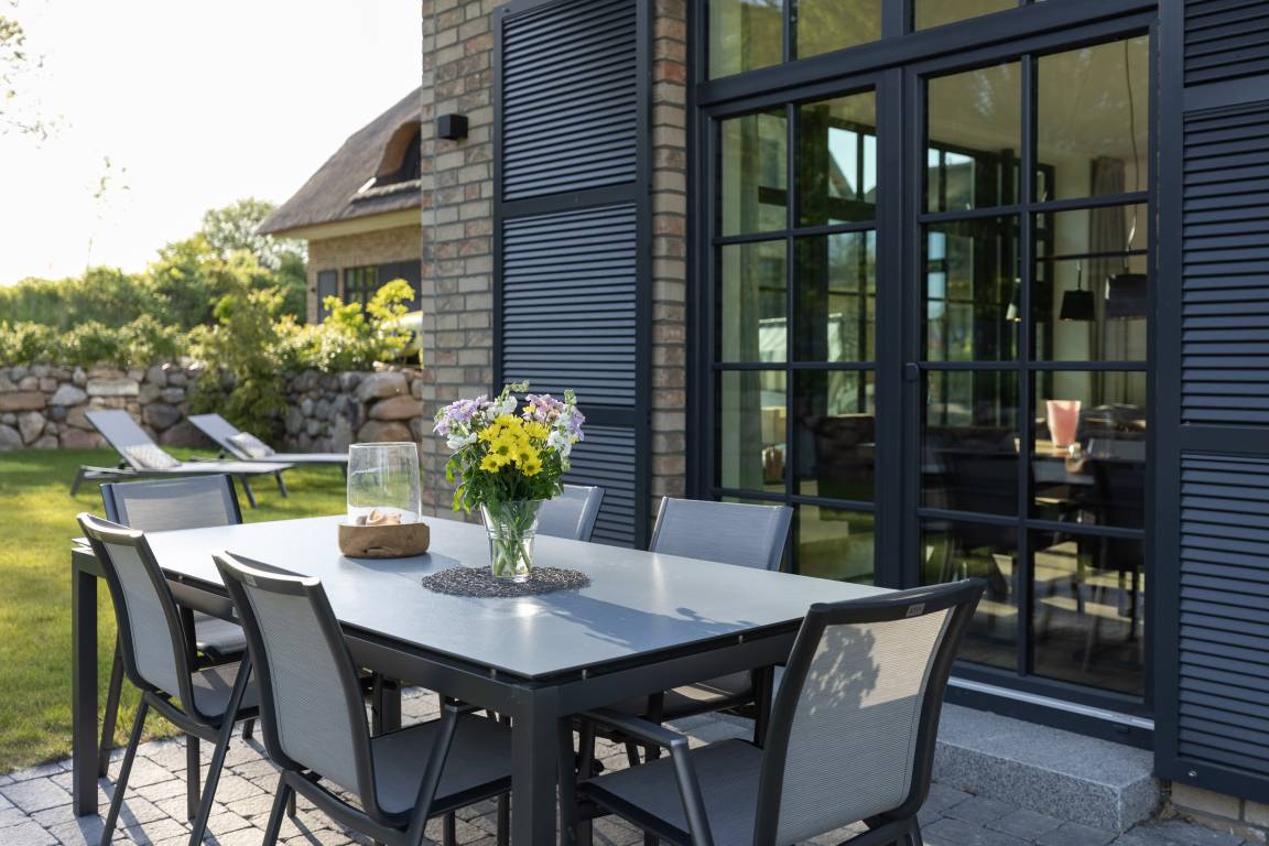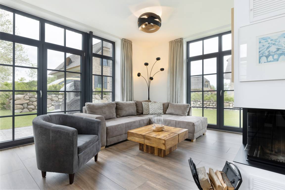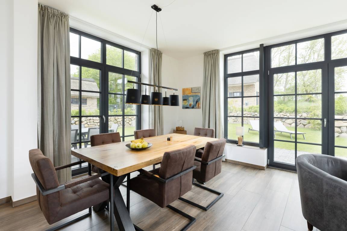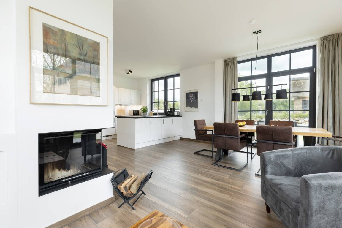 Die moderne, großzügige Küche ist offen angelegt und mit allem ausgestattet, was man benötigt, um nicht nur den schnellen Snack für zwischendurch, sondern auch das Mehrgangmenü am Abend zubereiten zu können. Großzügige Fensterfronten, ein komfortabler Esstisch und eine gemütliche Sitzgruppe vor dem Kamin prägen den lichtdurchfluteten Wohnbereich. Und was gibt es Schöneres an kühlen Abenden, als das Flackern von brennenden Holzscheiten im Kamin! Wer die raue Schönheit der Küste in Herbst und Winter liebt, weiß die Wärme und Behaglichkeit eines Kaminfeuers zu schätzen. Denken Sie daher bei Ihrer Buchung am besten gleich daran, Kaminholz für den ersten Abend zu bestellen.