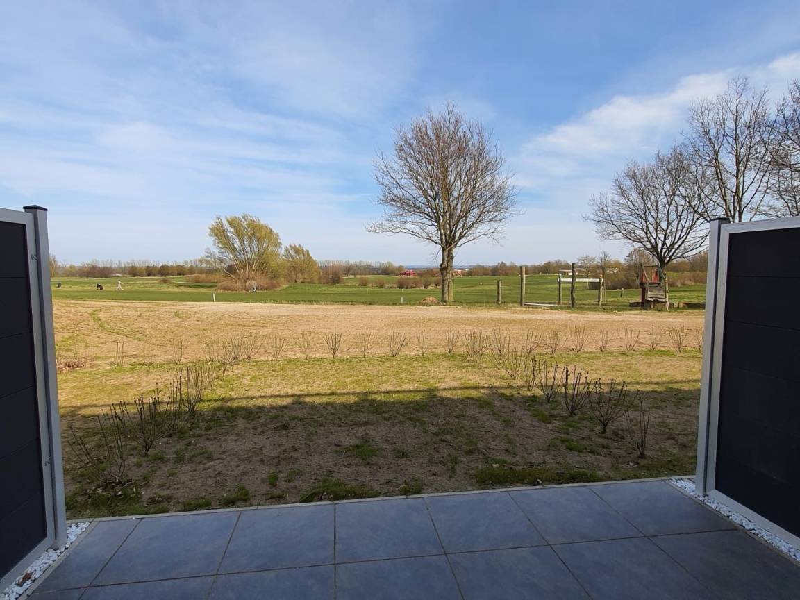 Die großzügige Terrasse mit Sitzgruppe bietet direkten Zugang zum Garten. Von dort lässt sich der Blick auf den Golfplatz, die Ostsee und die Insel Poel genießen.