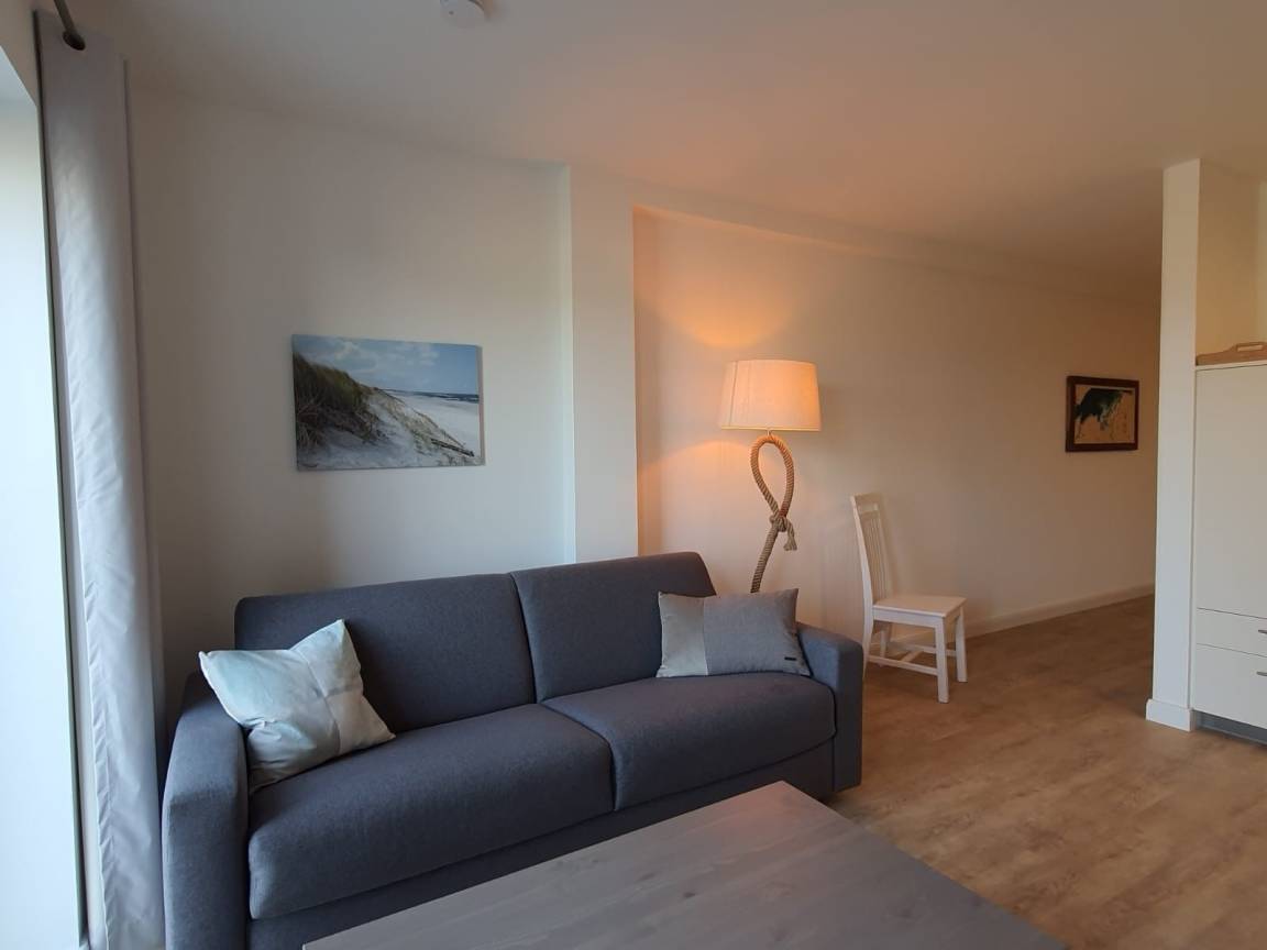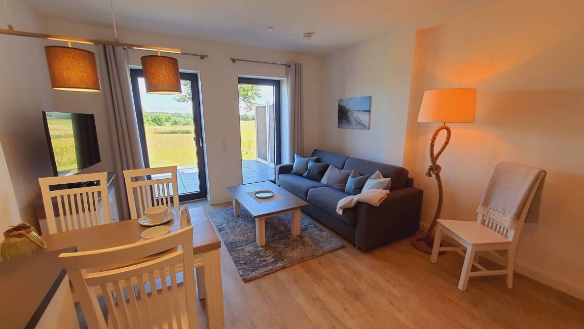 Ankommen und sich wohlfühlen. Die liebevoll ausgestattete Wohnung strahlt Gemütlichkeit aus. Das geräumige und helle Wohnzimmer mit direktem Zugang zur Terrasse empfängt Sie mit einer gemütlichen Sitzecke mit (Schlaf-) Couch und Tisch. Ein großes TV-Gerät mit integriertem Radio gehören ebenso zur Ausstattung.