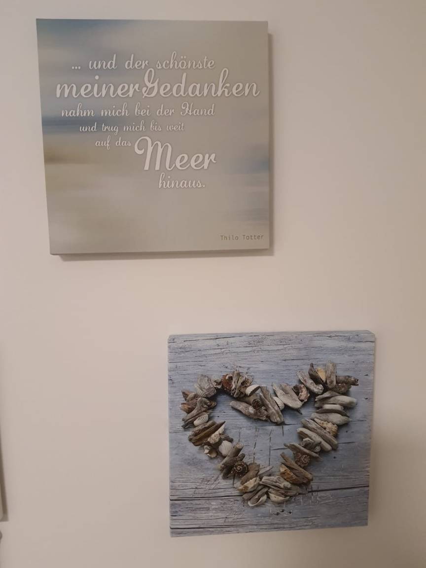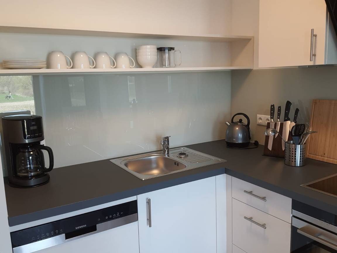 Die offene Küche, in der sich die Farben der nahen Ostsee widerspiegeln, erfüllt alle Erwartungen. Hochwertige Elektrogeräte: Herd (mit Induktionskochfeld und Backofen mit integrierter Mikrowelle), Dunstabzug, Kühlschrank (mit TK-Fach) und Spülmaschine, aber auch Kaffeemaschine, Toaster und Wasserkocher. Und neben Besteck und Geschirr auch Teekanne, Tablett und diverse andere kleine und große Ausstattungsgegenstände. Ihre Mahlzeiten können Sie an einem schönen Esstisch einnehmen.
