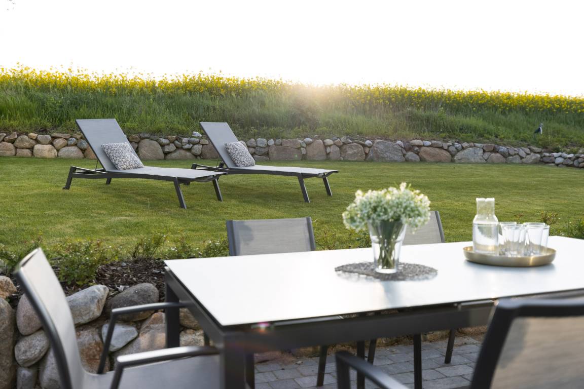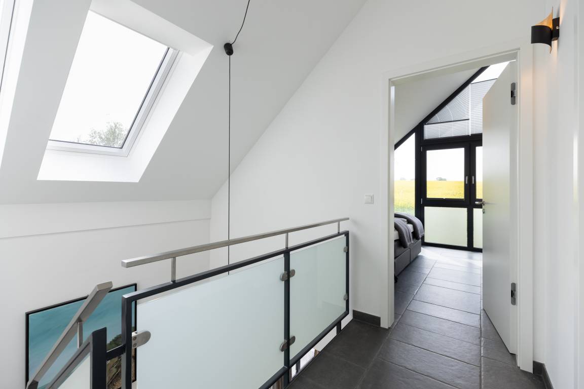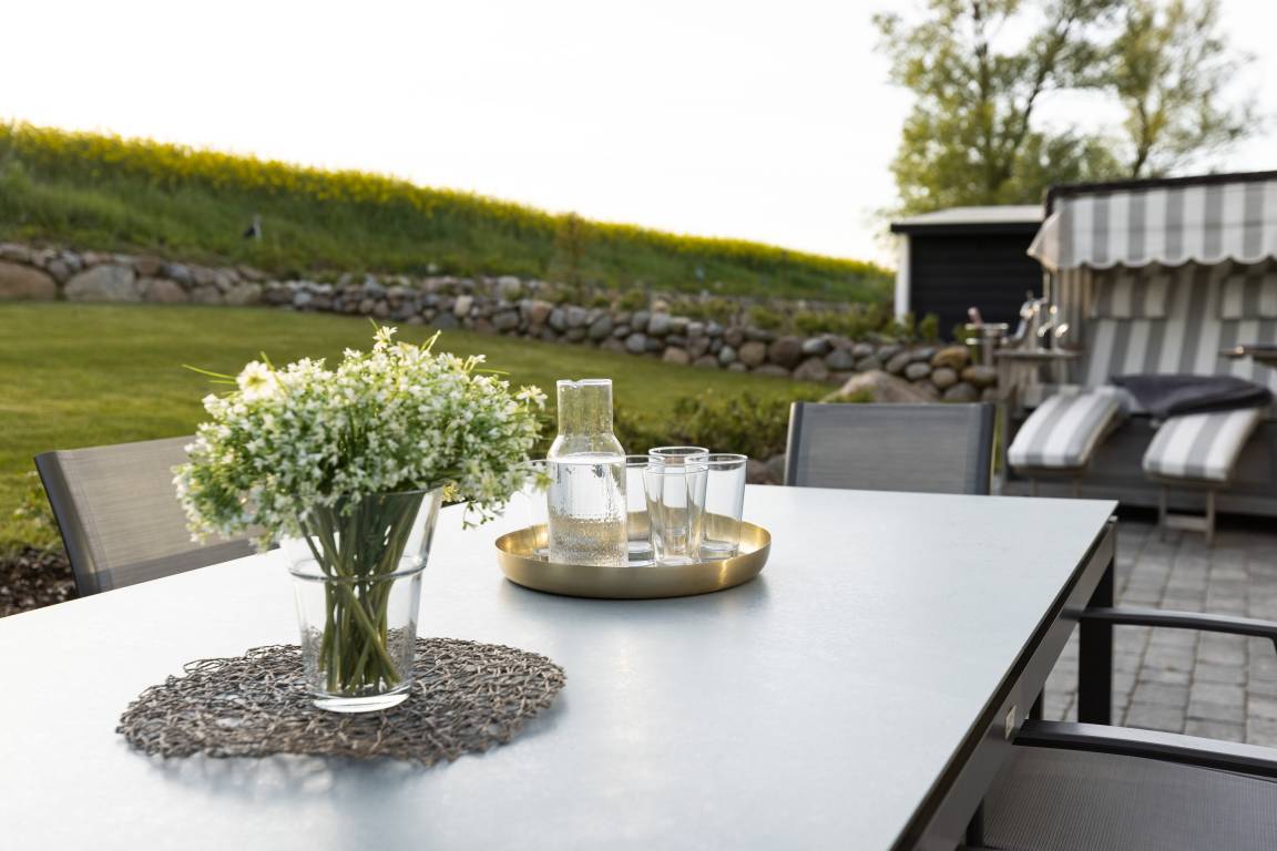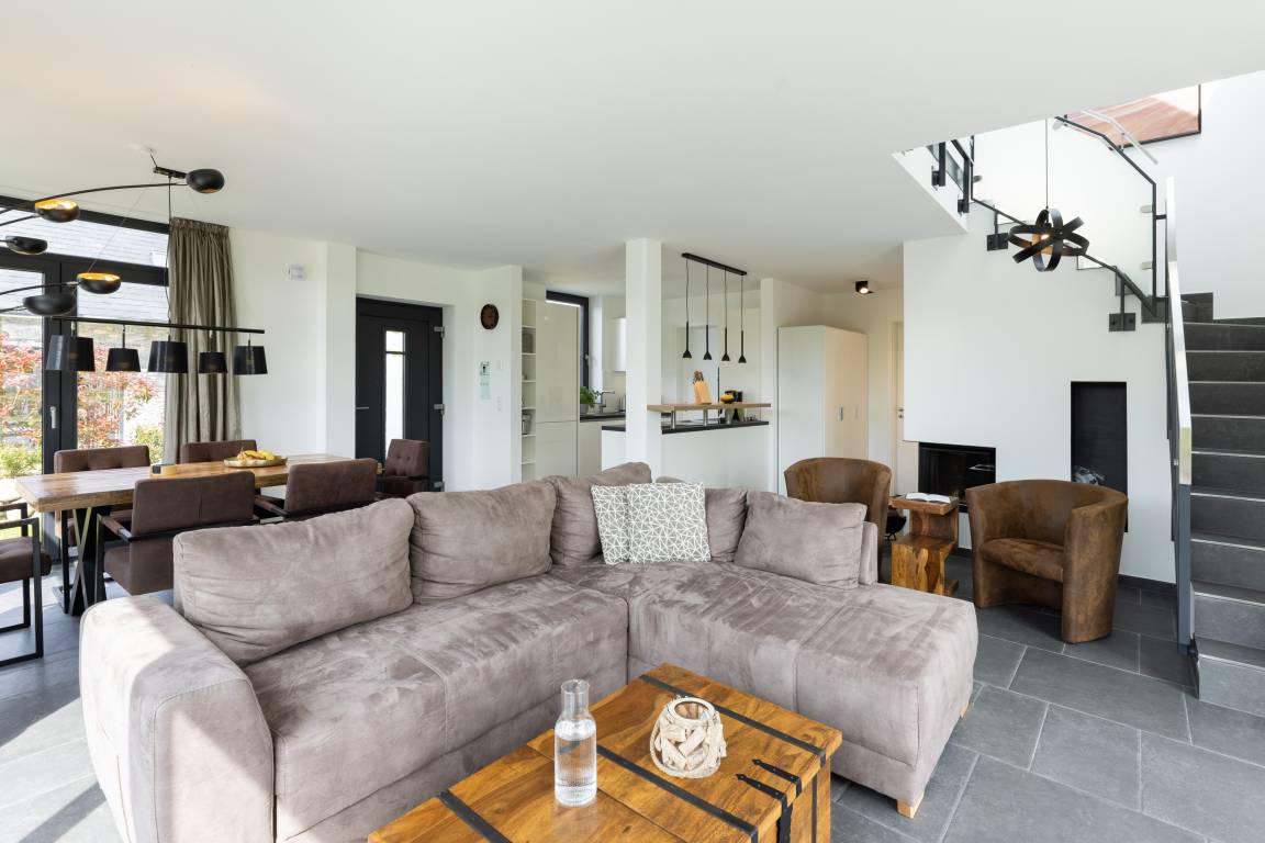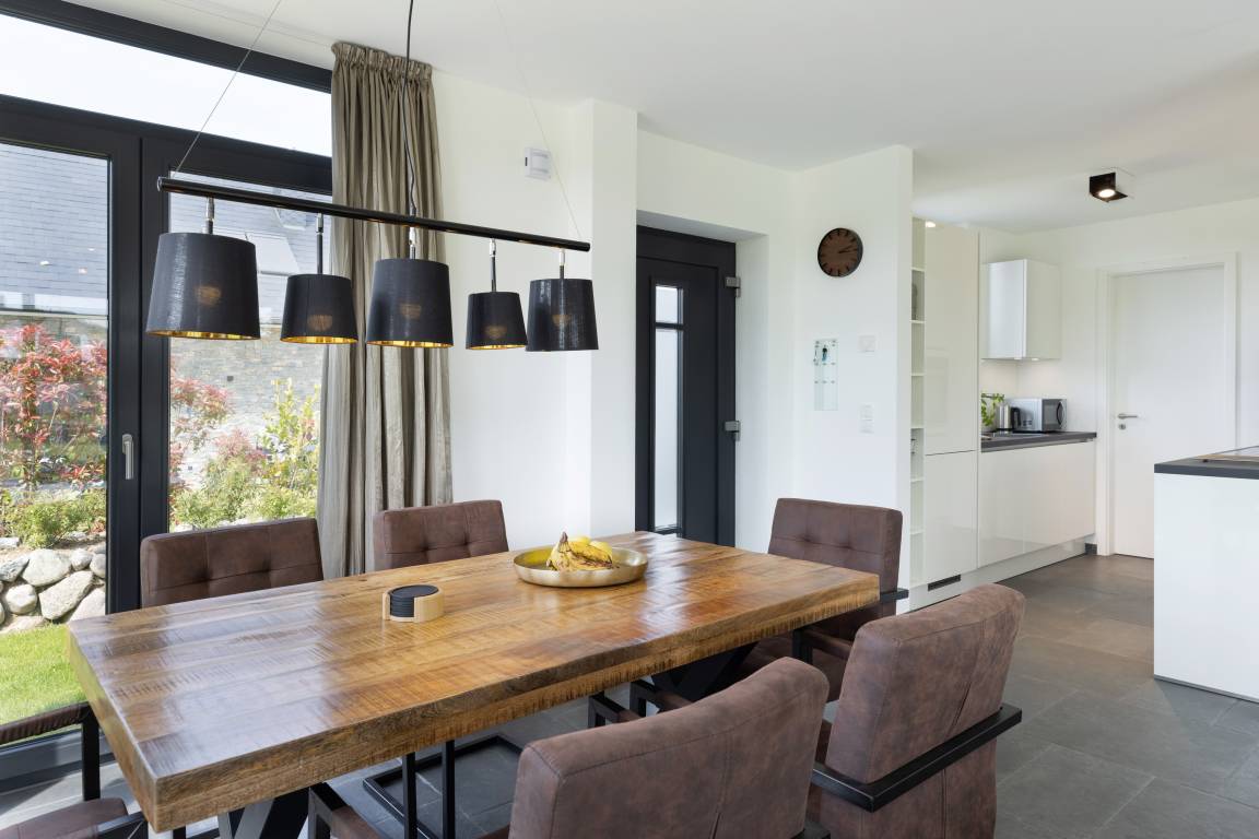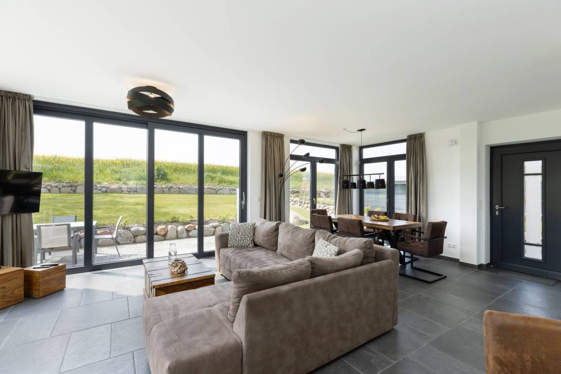 Die moderne Küche ist offen angelegt und mit allem ausgestattet, was man benötigt, um nicht nur den schnellen Snack für zwischendurch, sondern auch das Mehrgangmenü am Abend zubereiten zu können. Großzügige Fensterfronten, ein komfortabler Esstisch und eine gemütliche Sitzgruppe prägen den lichtdurchfluteten Wohnbereich. Und was gibt es Schöneres an kühlen Abenden, als das Flackern von brennenden Holzscheiten im Kamin! Wer die raue Schönheit der Küste in Herbst und Winter liebt, weiß die Wärme und Behaglichkeit eines Kaminfeuers zu schätzen. Denken Sie daher bei Ihrer Buchung am besten gleich daran, Kaminholz für den ersten Abend zu bestellen.