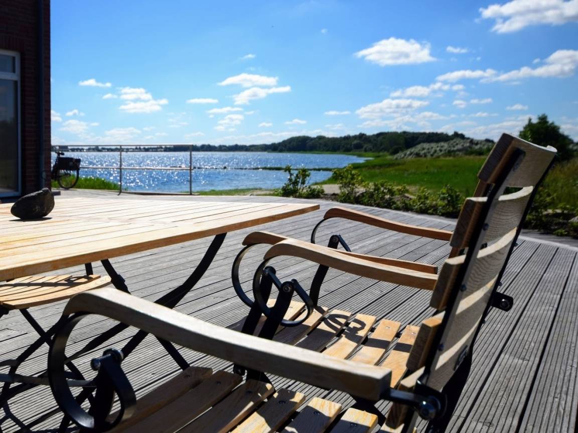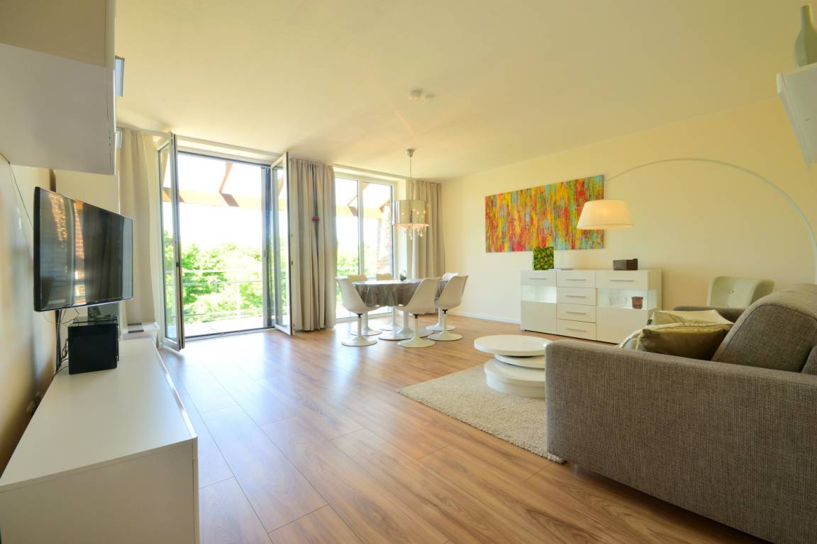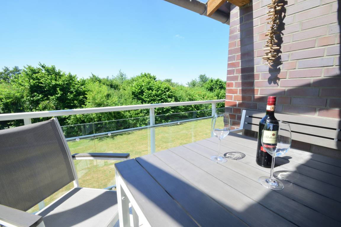 Im Untergeschoss befindet sich das großzügige, helle Wohnzimmer mit Sat-TV (Smart-TV mit Internet), Spielen, Büchern und DVDs für Erwachsene und Kinder, ein großer Esstisch, Stereoanlage und Blu-Ray Player. WLAN steht Ihnen auf dem gesamten Gelände kostenlos zur Verfügung. Das große Sofa lässt sich bequem zu einem hochwertigen Bett mit Kaltschaummatratze und Ergo-Flex Lattenrost umbauen. Die Fenster in der Wohnung sind mit Fliegenschutzgittern ausgestattet. Vom Wohnzimmer gelangen Sie auf den Balkon, von dem Sie einen herrlichen Blick über die naturbelassene, unverbaute Halbinsel bis zur Ostsee genießen können. Vom Balkon können Sie zudem traumhafte Sonnenuntergänge bei einem Glas Wein genießen. Der Balkon ist mit einer Sitzgruppe, 2 Klapp-Hochlehnern und Kinderstühlen ausgestattet.