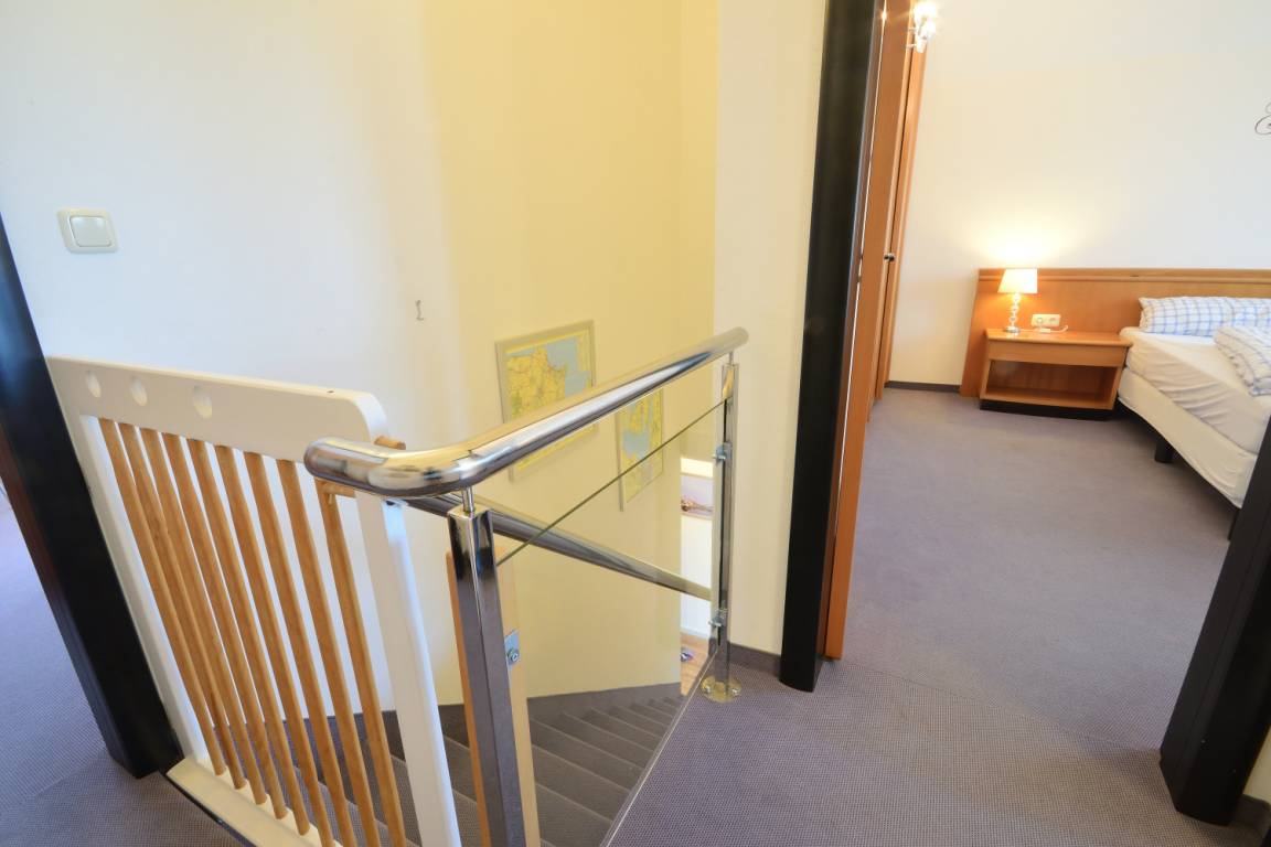 Über eine Treppe, welche mit Kinderschutzgittern versehen ist, gelangen Sie in das Obergeschoss. Hier befindet sich das größere Badezimmer mit Badewanne, WC, Waschbecken, Badewannen- Wickelauflage und Fenster mit Blick über die Halbinsel.