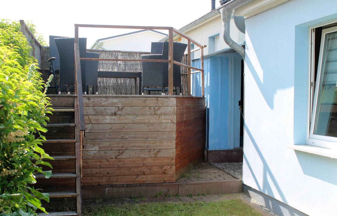 Außenbereich: An der Vorderseite des Ferienhauses befindet sich eine Terrasse (zur Hälfte überdacht) mit Sitzmöglichkeiten, Tisch, Hollywoodschaukel und Grill. Auf der Rückseite des Ferienhauses ist eine Hochterrasse mit bequemen Sitzmöbeln, von der aus sie ebenfalls den Blick über die schöne Bucht der " Wohlenberger Wiek" genießen können. Es bestehen neben dem Ferienhaus Parkmöglichkeiten für zwei PKW