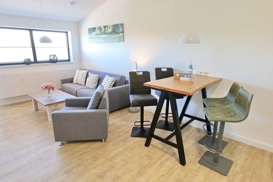 Hier machen Sie es sich zum Fernsehen, oder Musik hören über das Internetradio-USB- gemütlich. Selbstverständlich nutzten Sie das WLAN gebührenfrei. Gäste, die sich gerne eigenständig mit Mahlzeiten versorgen möchten, werden die voll ausgestattete Einbauküche zu schätzen wissen. Ihre zubereiteten Mahlzeiten können Sie am Esstresen oder bei wärmeren Außentemperaturen gerne auf der saisonal möblierten Dachterrasse zu sich nehmen. Idealerweise verfügt das Appartement über zwei separate Schlafzimmer 1x mit Doppelbett und einem Kleiderschrank. Das zweite Schlafzimmer ist mit einem breiten Bett 140cm x 200cm, sowie einem Kleiderschrank ausgestattet.