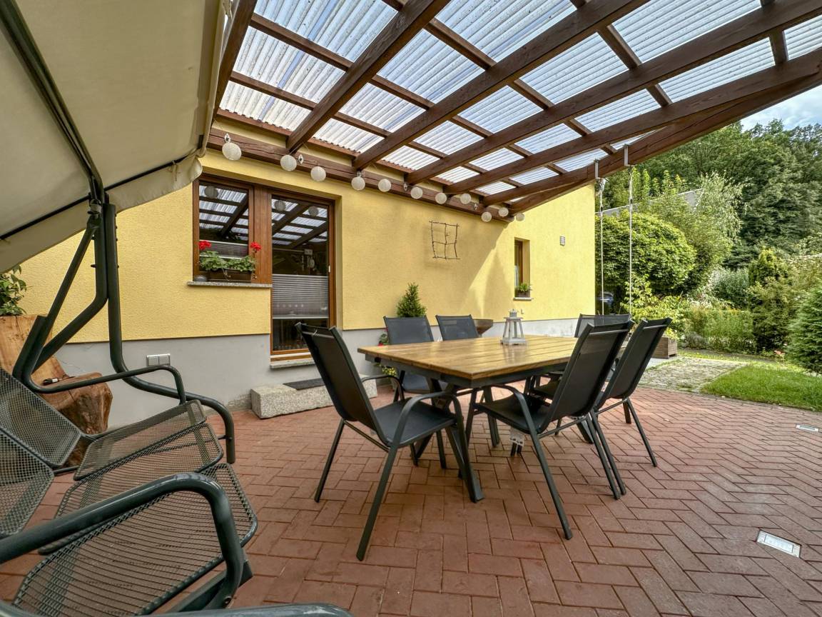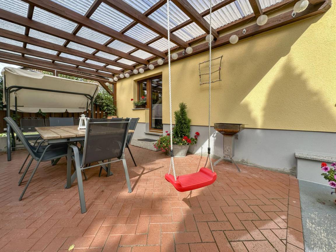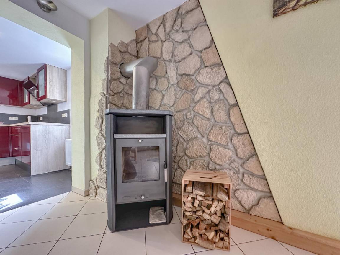 Hausbeschreibung : Das komfortable Ferienhaus liegt im ruhigen Dorf Lohsdorf bei Hohnstein in der Sächsischen Schweiz. Ein Holzofen im Wohn- und Esszimmer sorgt für eine angenehme Atmosphäre. Im Obergeschoß liegen ein offener Schlafbereich mit Doppelbett und ein Zimmer mit zwei Einzelbetten. Das Haus ist sehr kinderfreundlich eingerichtet und verfügt über Kinderbett, Hochstuhl sowie ein Spielhaus. Draußen laden die große, überdachte Terrasse und der teilweise eingezäunte Garten zum Genießen ein