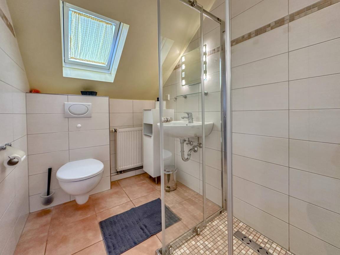 In der 1. Etage: Schlafzimmer mit 2x Einzelbett(90 x 200 cm) , Durchgangsschlafzimmer mit Doppelbett(180 x 200 cm) , Badezimmer mit Dusche, Waschbecken, Toilette, Föhn