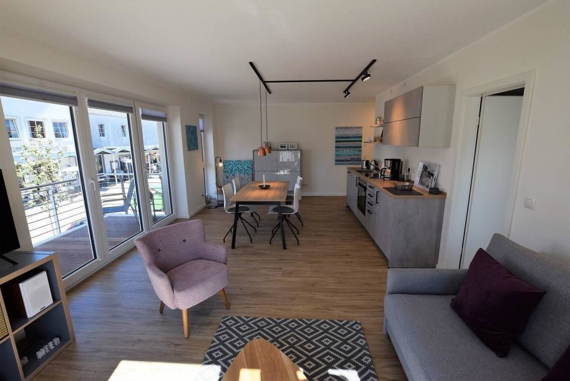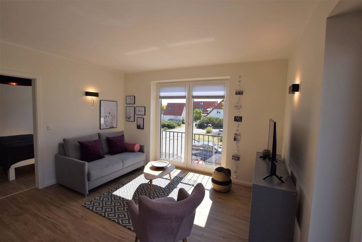 Die Ferienwohnung "ENNA MARE" befindet sich im 1. OG der modernen Ferienanlage "Meeresblick" und bietet auf 53 qm Platz für bis zu 3 Personen. Die helle, lichtdurchflutete Wohn- und Esszimmer mit offener Küche ist mit bodentiefen Fenstern ausgestattet und öffnet sich zu einem seitlichen Balkon mit Meerblick. Die Küche ist vollständig ausgestattet und verfügt über einen Samsung TV, eine Musikanlage und kostenloses WLAN. Der Flur bietet einen eingebauten Garderobenschrank, während das moderne Duschbad mit einem Waschtisch, einem beleuchteten Spiegel und einem Handtuchwärmer überzeugt. Das Schlafzimmer verfügt über ein Doppelbett (1,80 x 2,00 m) und einen Kleiderschrank sowie einen kleinen Schreibtisch. Die gesamte Wohnung wurde aufwendig und stilvoll neu eingerichtet. Haustiere sind willkommen. Gemeinschaftliche Fahrradstellplätze sind im abschließbaren Innenraum vorhanden.