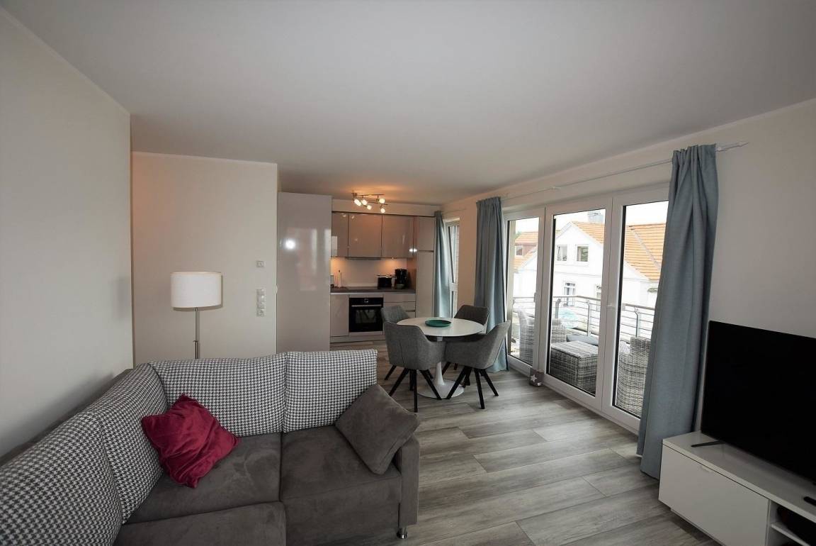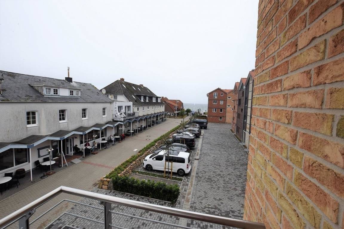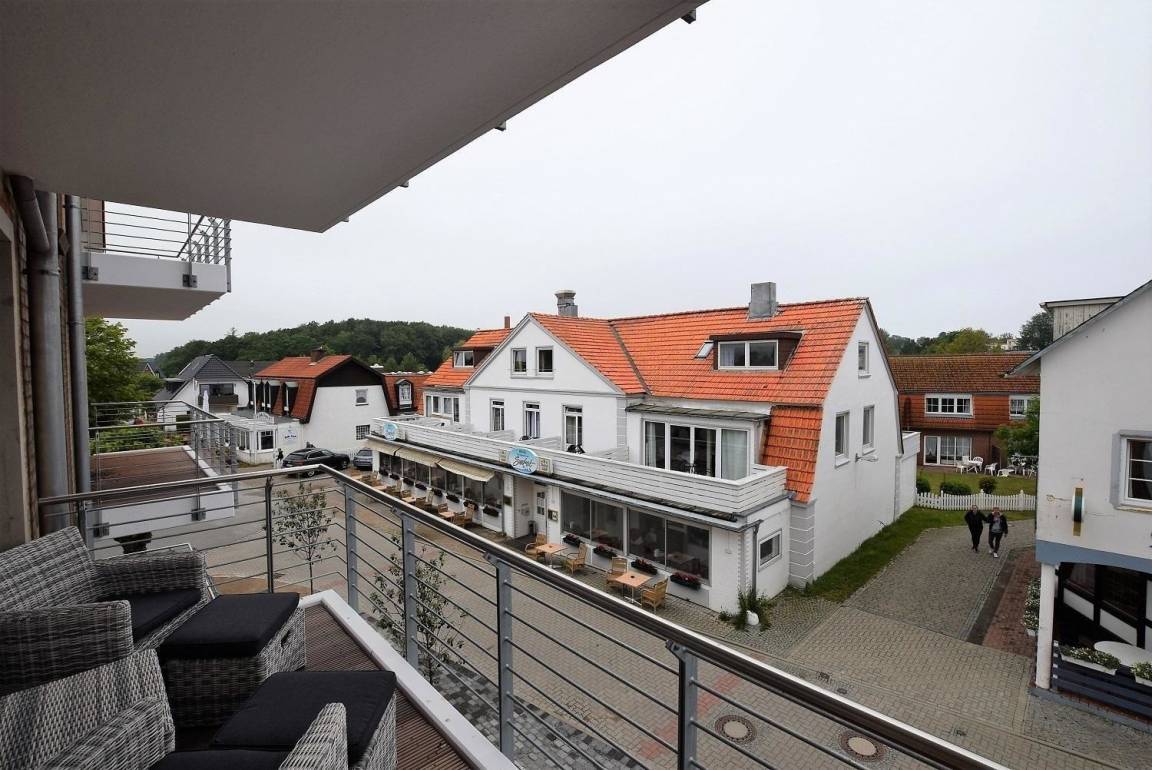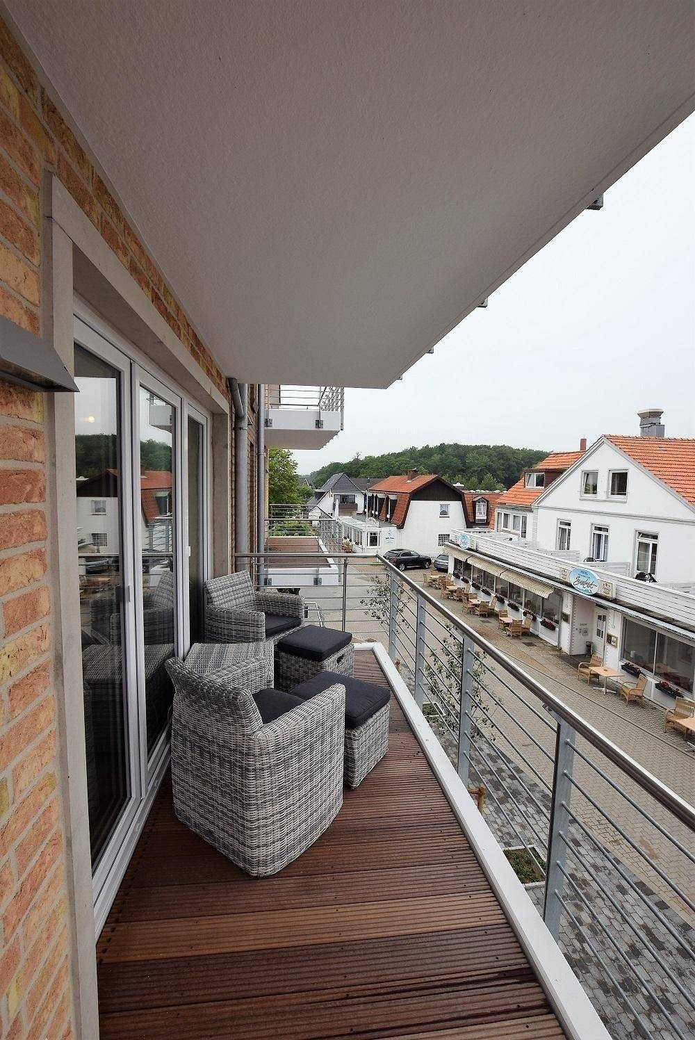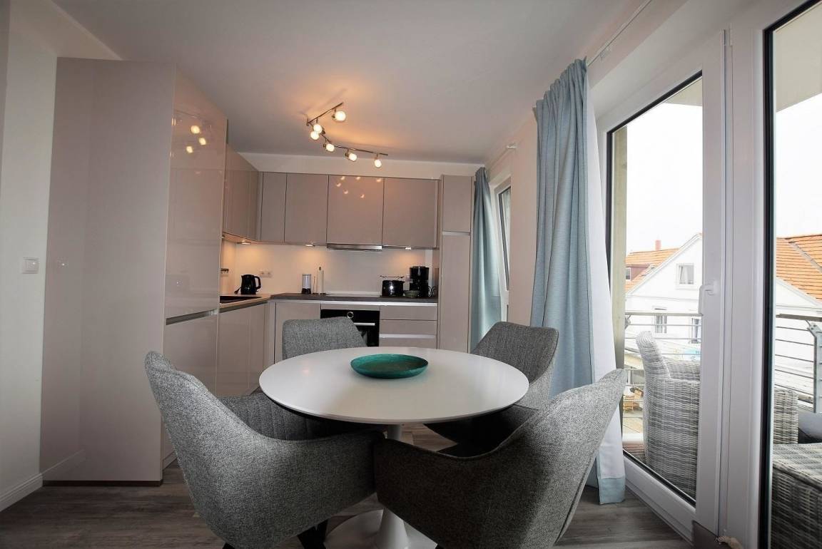 Die Ferienwohnung „Jakobsmuschel" überzeugt durch einen einladenden Außenbereich, der mit einem Balkon ausgestattet ist. Hier genießen die Gäste seitlichen Meerblick und können auf den Balkonmöbeln entspannen. Lediglich die Strandpromenade trennt die Unterkunft vom Sandstrand und der Ostsee, was einen direkten Zugang zum Meer ermöglicht.