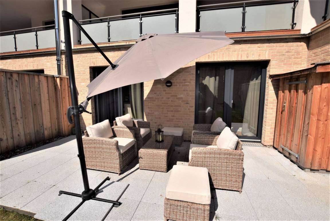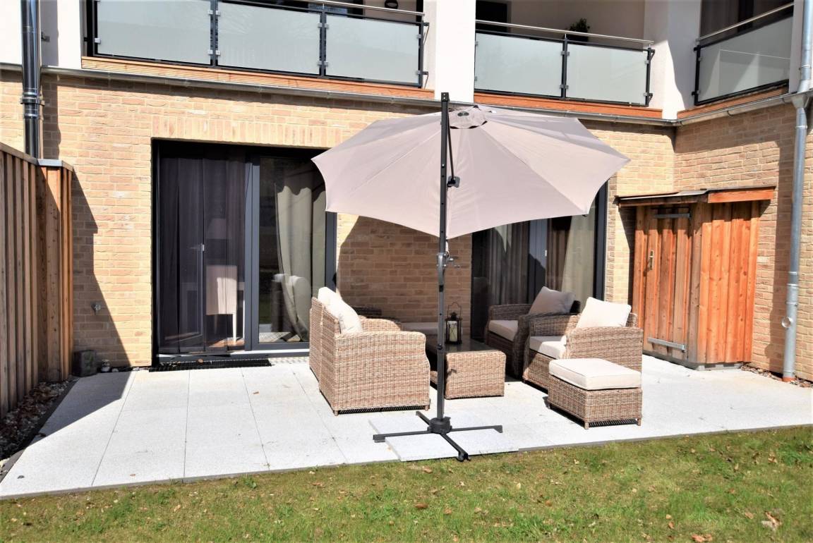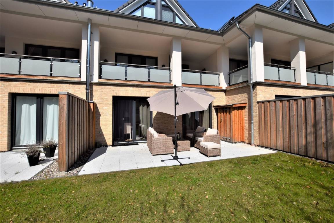 Der Außenbereich der modernen Ferienwohnung aus dem Jahr 2017 bietet eine 30 qm große Südterrasse, ausgestattet mit gemütlichen Gartenmöbeln und einem Grill – ideal für entspannte Abende im Freien. Die Wohnung befindet sich nur ca. 300 Meter vom Strand entfernt, sodass das Meer schnell erreichbar ist. Für Familien mit Kindern steht in unmittelbarer Nähe ein Abenteuerspielplatz zur Verfügung, der nur etwa 200 Meter entfernt liegt. Zudem sind Fahrradstellplätze direkt auf dem Grundstück vorhanden, was die Erkundung der Umgebung erleichtert. Ein Strandkorb am Objekt lädt zum Relaxen ein. Trotz der zentralen Lage der Unterkunft sind mehrere Restaurants fußläufig erreichbar. Der barrierefreie Zugang zur Wohnung sowie ein eigener PKW-Stellplatz am Haus runden das Angebot ab. Haustiere sind willkommen, wodurch der Außenbereich auch für vierbeinige Begleiter einladend gestaltet ist.