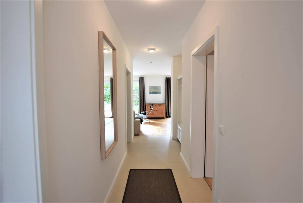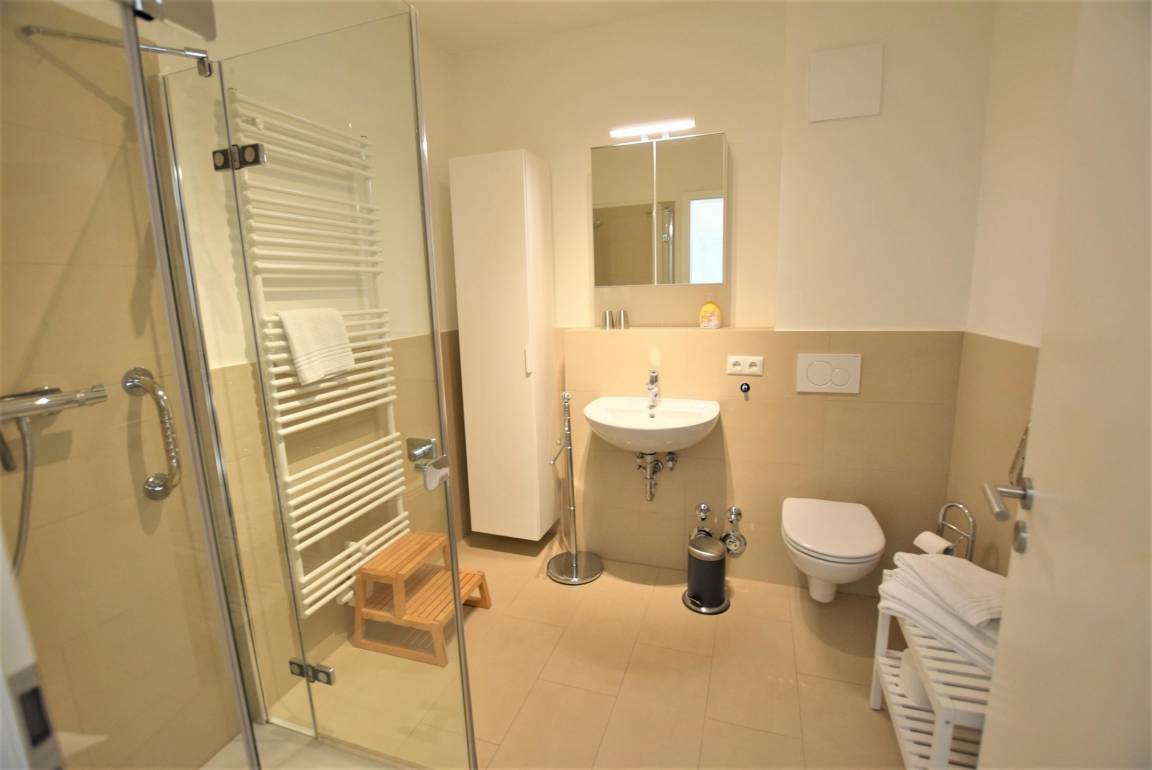 Dieses moderne Ferienobjekt aus dem Jahr 2017 erstreckt sich über 79 qm und bietet Platz für bis zu 4 Personen. Es besticht durch ein geräumiges Wohn-Esszimmer (28 qm), ausgestattet mit einem großen Fernseher. Die beiden Schlafzimmer bestehen aus einem Doppelbett (180x200) und einem Ausziehbett (160x200). Das Badezimmer ist großzügig gestaltet und verfügt über eine Dusche, WC sowie eine Fußbodenheizung. Die hochwertige, komplett eingerichtete Küche bietet reichlich Stauraum für alle Kochutensilien. Die Wohnung ist barrierefrei zugänglich und als Nichtraucherwohnung konzipiert. WLAN steht zur Verfügung. Ein eigener PKW-Stellplatz am Haus sowie eine gemeinschaftliche Nutzung eines Strandkorbs ergänzen das Angebot. Die Lage ist zentral, nur 300 Meter zum Strand und 200 Meter zu einem Edeka-Marktes mit Backshop. Haustiere sind ebenfalls willkommen, und es gibt Fahrradstellplätze auf dem Grundstück.