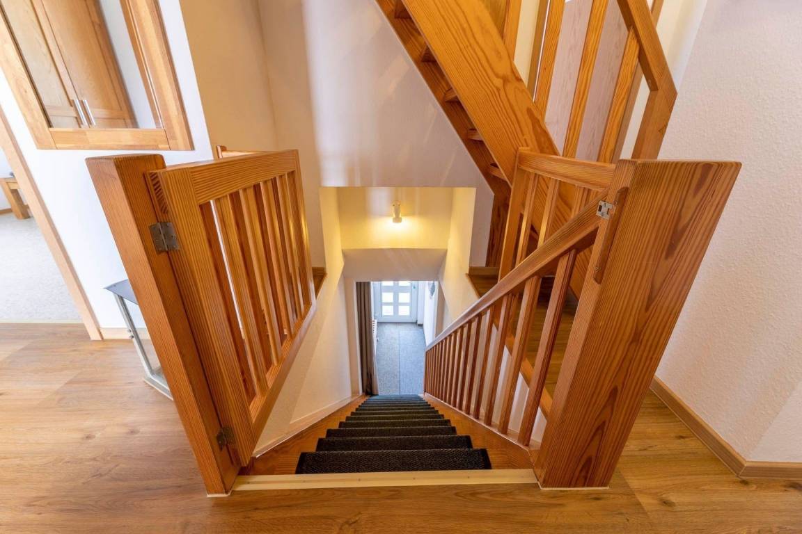 Die Ferienwohnung „Über dem Meer" im ersten Stock bietet mit ca. 100 m² Platz für bis zu 5 Personen. Sie verfügt über ein großzügiges Wohnzimmer mit zwei Ledersofas, einer Leseecke und einem Flatscreen. Die große, gut ausgestattete Küche mit Essplatz umfasst Herd, Backofen, Spülmaschine, Mikrowelle, Kühlschrank und einen kleinen Tiefkühler. Im Obergeschoss befindet sich ein komfortables Schlafzimmer mit Doppelbett und Duschbad. Über eine schmale Treppe gelangen Gäste zu zwei weiteren Schlafzimmern, die miteinander verbunden sind, jeweils mit zwei Betten oder einem Einzelbett sowie einem gemeinsamen Duschbad. Eine Leselounge zwischen den Zimmern bietet einen Rückzugsort. Zur Unterhaltung stehen kostenloses WLAN und eine Musikanlage zur Verfügung. Außenspielmöglichkeiten im Garten und auf der Liegewiese können ebenfalls genutzt werden. Haustiere sind nicht erlaubt, Grillen ist nicht gestattet.