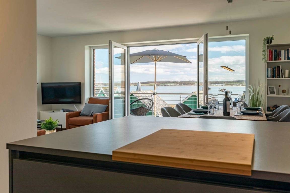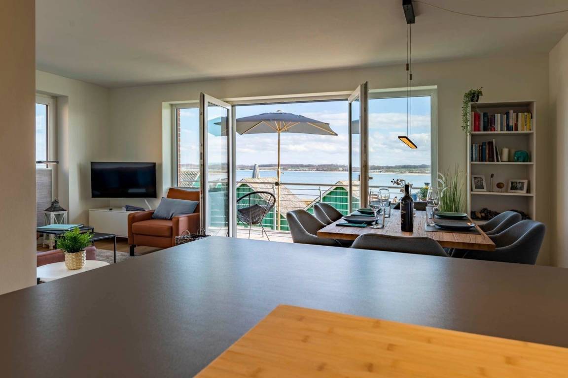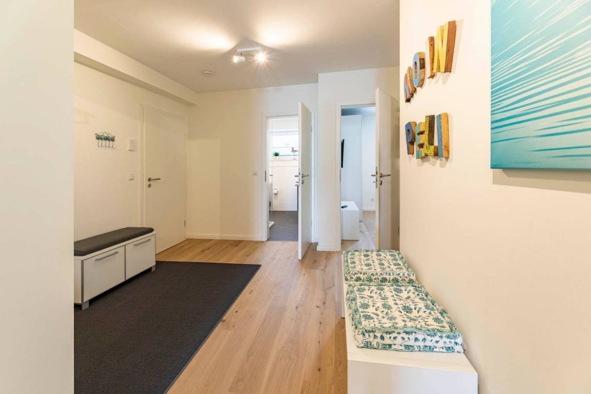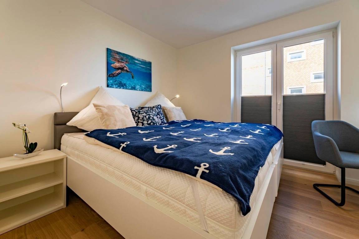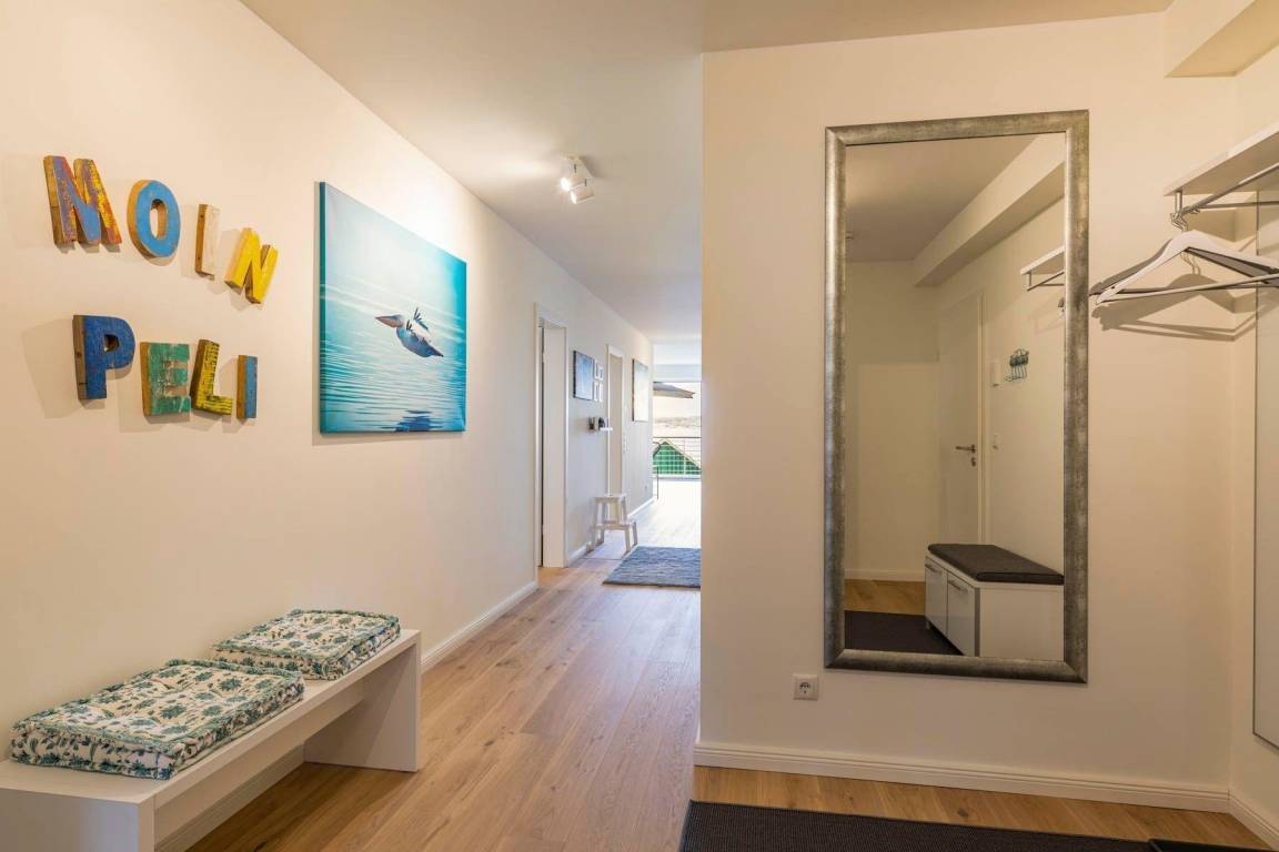 Die Ferienwohnung „Pelikan" im 1. Obergeschoss des Hauses "Meeresblick" bietet Platz für bis zu sechs Personen und begeistert mit modernem Design und hochwertiger Ausstattung. Der Wohn- und Essbereich ist lichtdurchflutet und bietet Zugang zu einem Balkon mit Meerblick. Eine geschmackvolle Küche ist mit Geschirrspülmaschine, Induktionskochfeld, Backofen und Kühlschrank mit Gefriermöglichkeit ausgestattet. Die Schlafzimmer verfügen jeweils über Boxspringbetten und große Kleiderschränke; zwei dieser Zimmer sind zusätzlich mit Fernsehern ausgestattet. Zwei Bäder mit Dusche/WC und praktischen Waschbecken bieten genügend Stauraum. Die Wohnung ist eine Nichtraucherunterkunft und erlaubt einen Hund bis 60 cm Höhe. Ein fester Parkplatz sowie Abstellmöglichkeiten für Fahrräder stehen zur Verfügung. Der Fahrstuhl sorgt für einen bequemen Zugang zur Wohnung. WLAN ist kostenlos nutzbar.