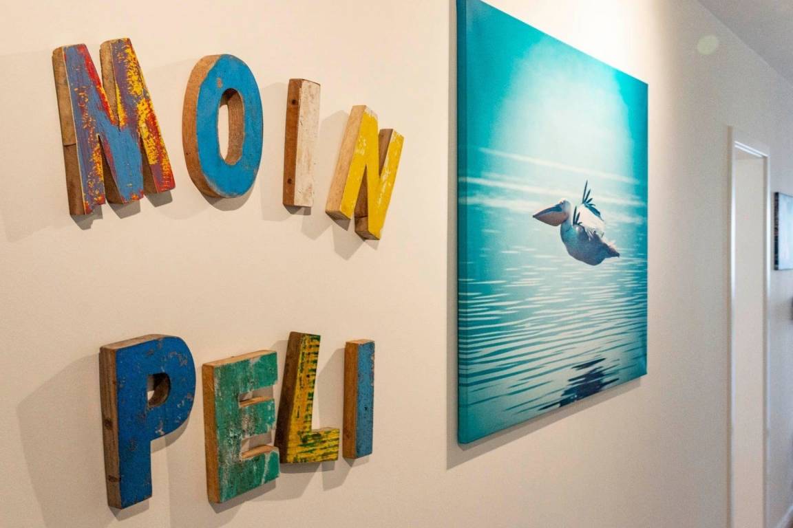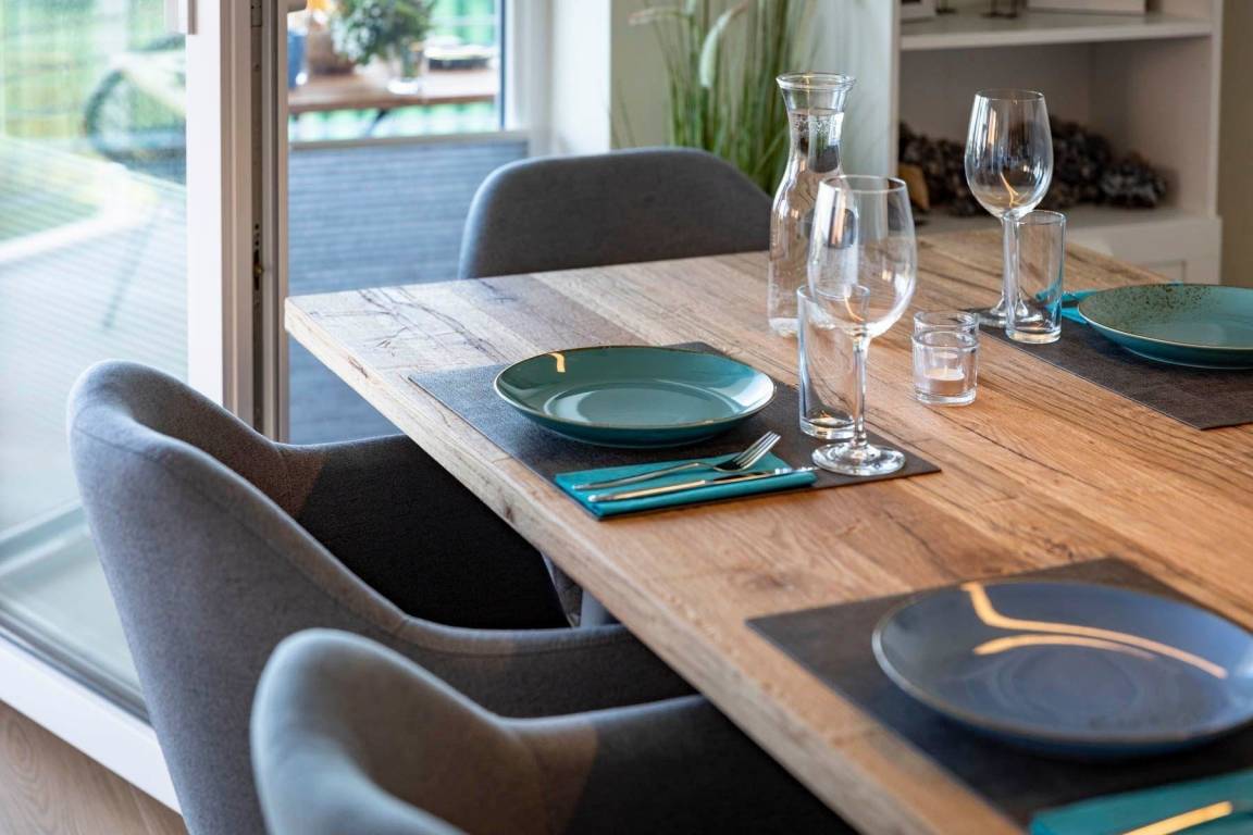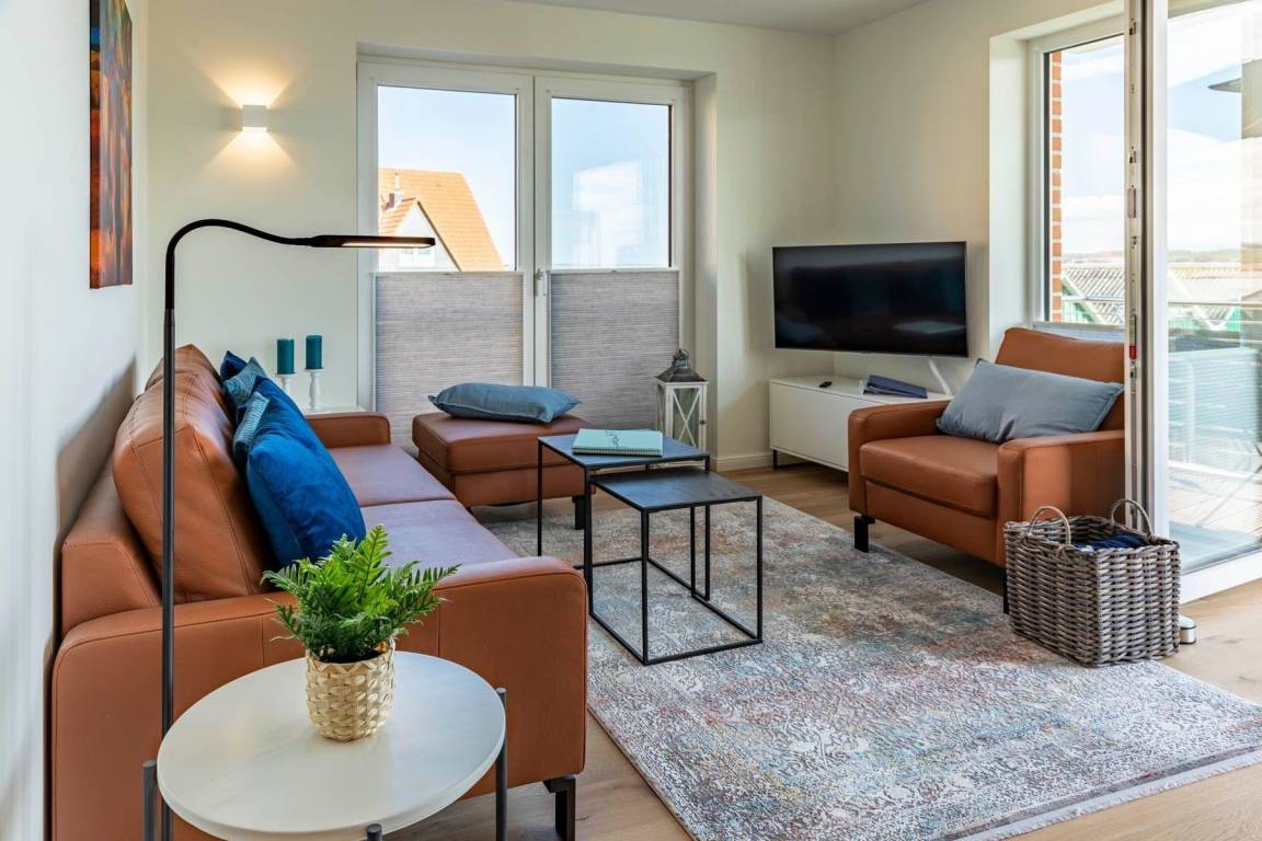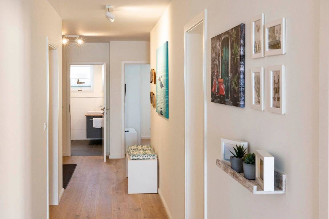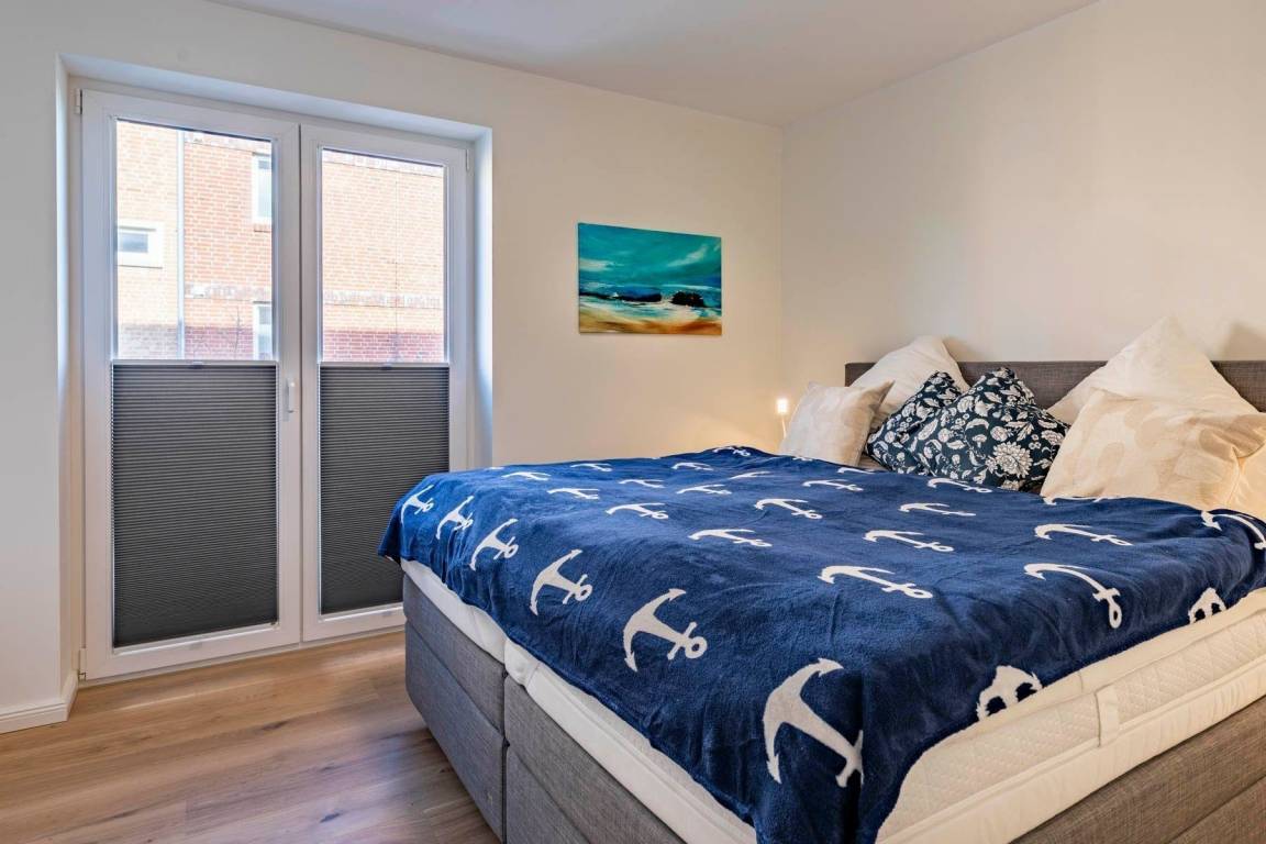 Die Ferienwohnung „Pelikan" im 1. Obergeschoss des Hauses "Meeresblick" bietet Platz für bis zu sechs Personen und begeistert mit modernem Design und hochwertiger Ausstattung. Der Wohn- und Essbereich ist lichtdurchflutet und bietet Zugang zu einem Balkon mit Meerblick. Eine geschmackvolle Küche ist mit Geschirrspülmaschine, Induktionskochfeld, Backofen und Kühlschrank mit Gefriermöglichkeit ausgestattet. Die Schlafzimmer verfügen jeweils über Boxspringbetten und große Kleiderschränke; zwei dieser Zimmer sind zusätzlich mit Fernsehern ausgestattet. Zwei Bäder mit Dusche/WC und praktischen Waschbecken bieten genügend Stauraum. Die Wohnung ist eine Nichtraucherunterkunft und erlaubt einen Hund bis 60 cm Höhe. Ein fester Parkplatz sowie Abstellmöglichkeiten für Fahrräder stehen zur Verfügung. Der Fahrstuhl sorgt für einen bequemen Zugang zur Wohnung. WLAN ist kostenlos nutzbar.