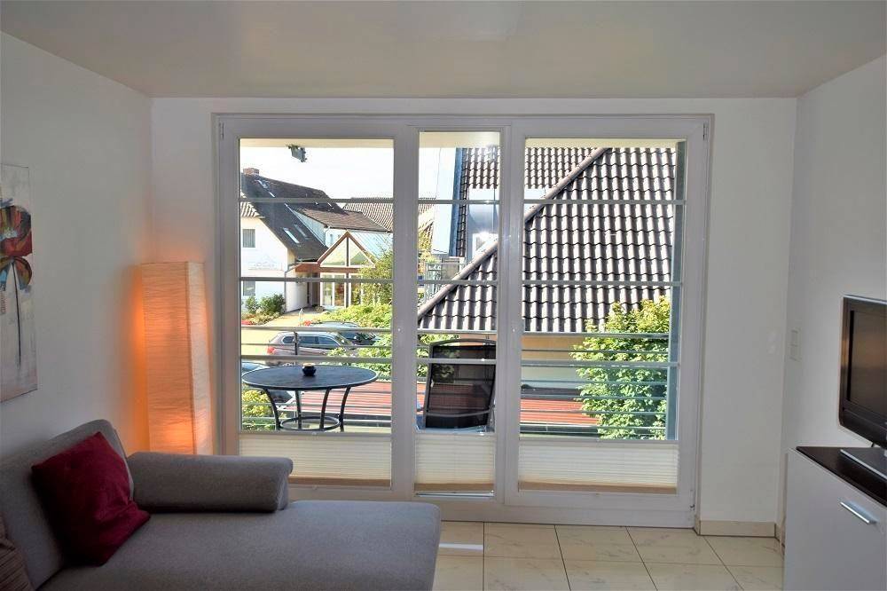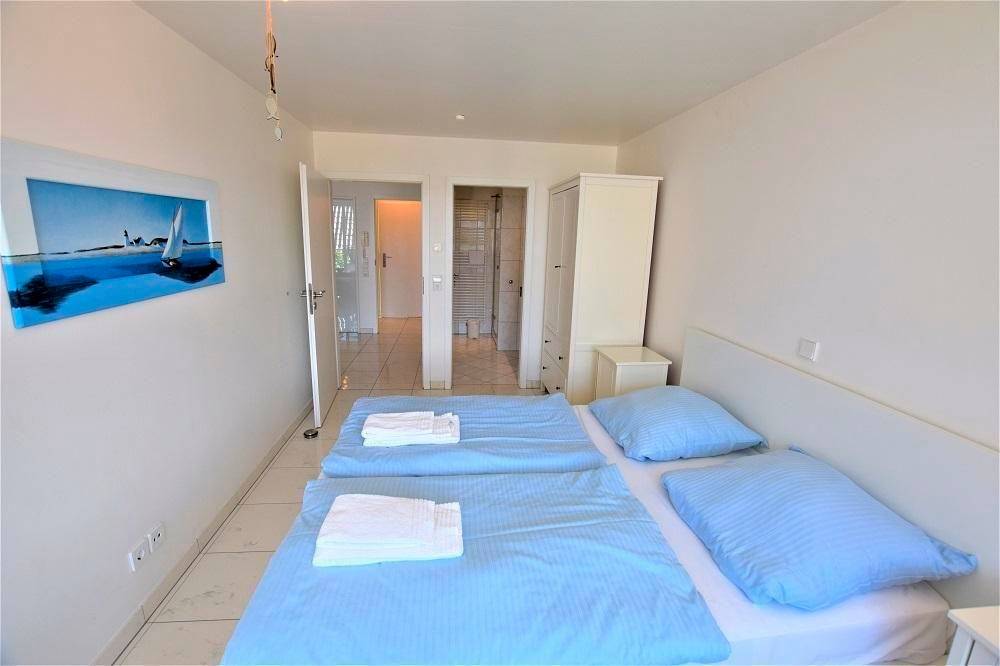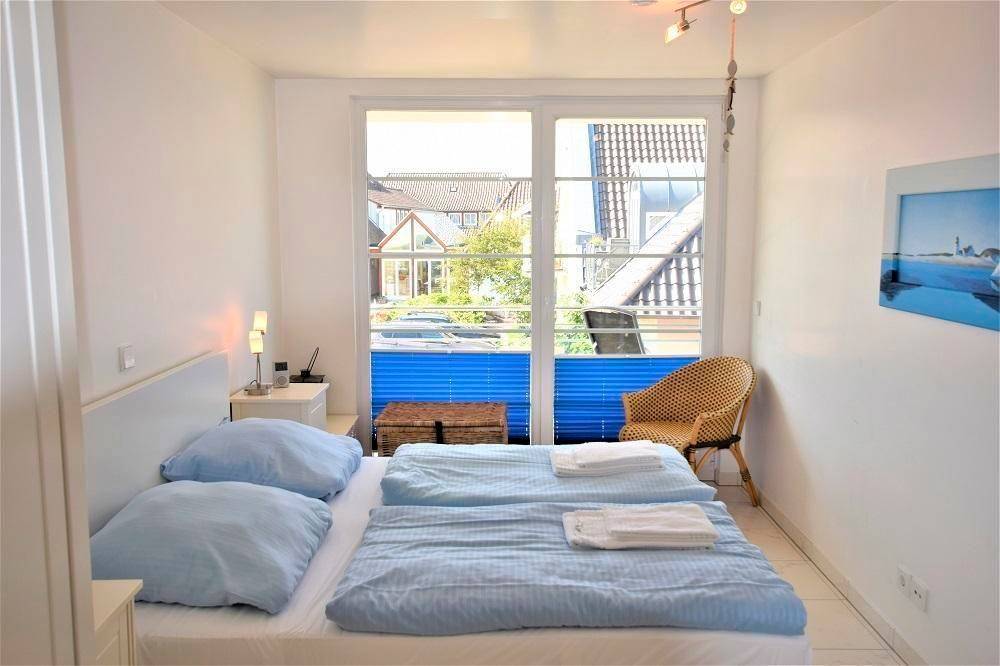 Die hochwertige Ferienwohnung im 1. Obergeschoss bietet auf 60 qm einen modern gestalteten Wohn- und Essbereich mit integrierter Küche sowie einen gemütlichen Schlafraum mit einem Doppelbett (160 x 200 cm). Ein besonderes Highlight ist der große Westbalkon, der einen herrlichen Meerblick ermöglicht. Die Wohnung verfügt über ein Bad mit Dusche und ein separates Gäste-WC. Zur Ausstattung gehören Kabel-TV, ein DVD-Player und eine Hi-Fi-Anlage. Gästen steht gegen einen Kostenbeitrag ein Wäschepaket (Bettwäsche und Handtücher) zur Verfügung. Im Untergeschoss befindet sich ein Waschsalon mit Waschmaschine, Trockner und Bügelmöglichkeiten. Ein Parkplatz ist vor dem Haus vorhanden. Der Mindestaufenthalt variiert je nach Saison zwischen 4 und 6 Übernachtungen.