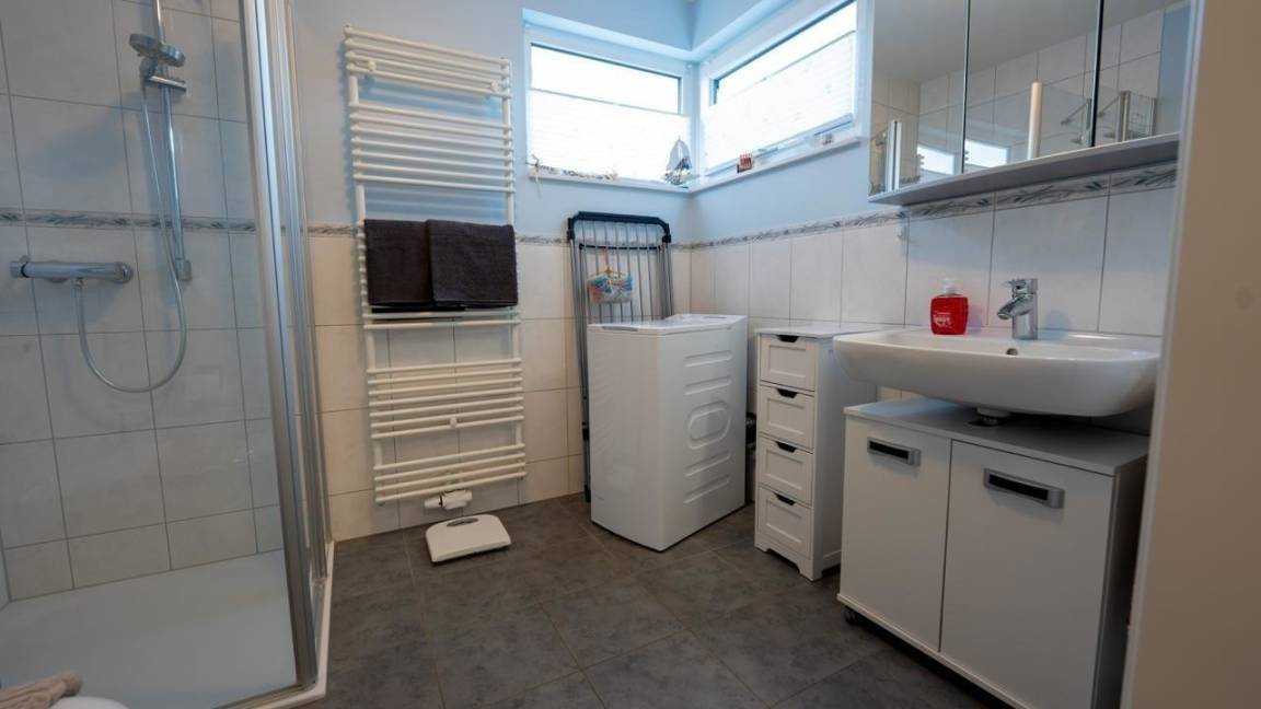 Außerdem ist ein Flur mit einer hübschen Garderobe vorhanden und ein großzügiges Bad mit Waschmaschine und DU / WC. Ein Satz Handtücher ( 2 Handtücher, 2 Duschtücher,1 Vorleger) ist vorhanden.