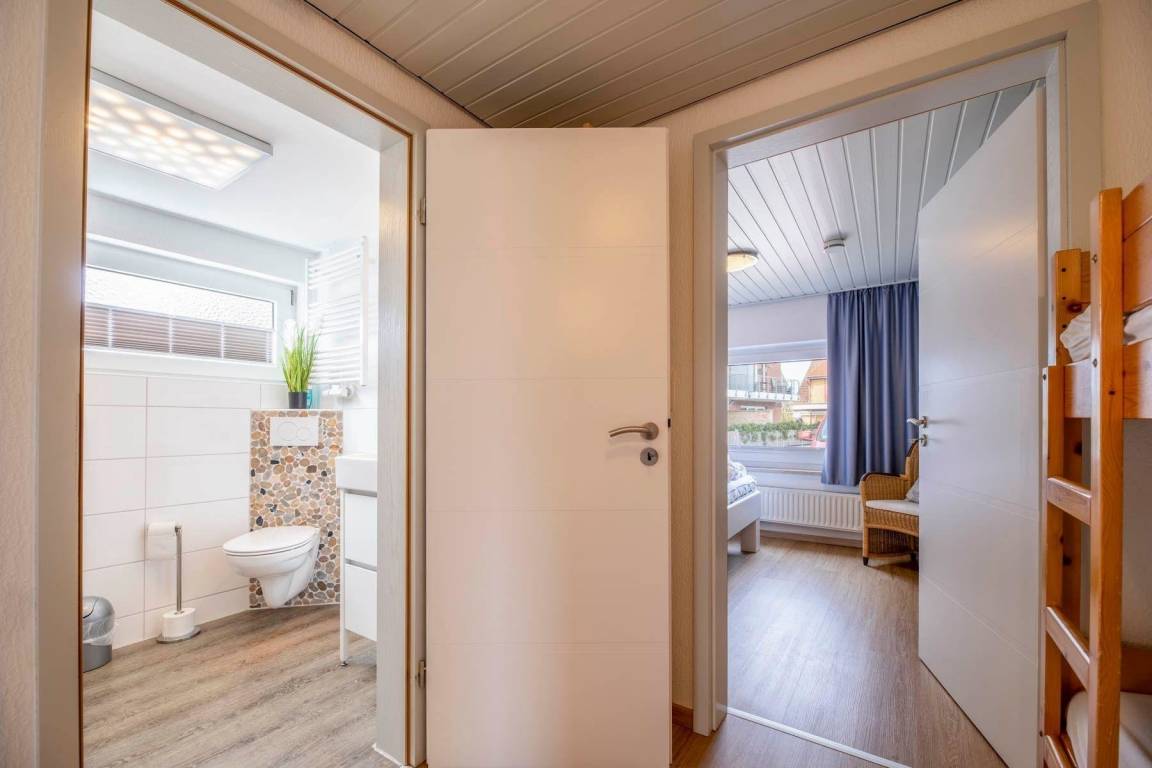 Die Ferienwohnung bietet eine anspruchsvolle Ausstattung und viel Komfort für einen erholsamen Aufenthalt. Sie verfügt über ein Schlafzimmer mit einem Doppelbett sowie ein Wohnschlafzimmer mit zwei Einzelbetten. Das Badezimmer ist mit einem Fenster ausgestattet und bietet Ablagemöglichkeiten mit Spiegel.