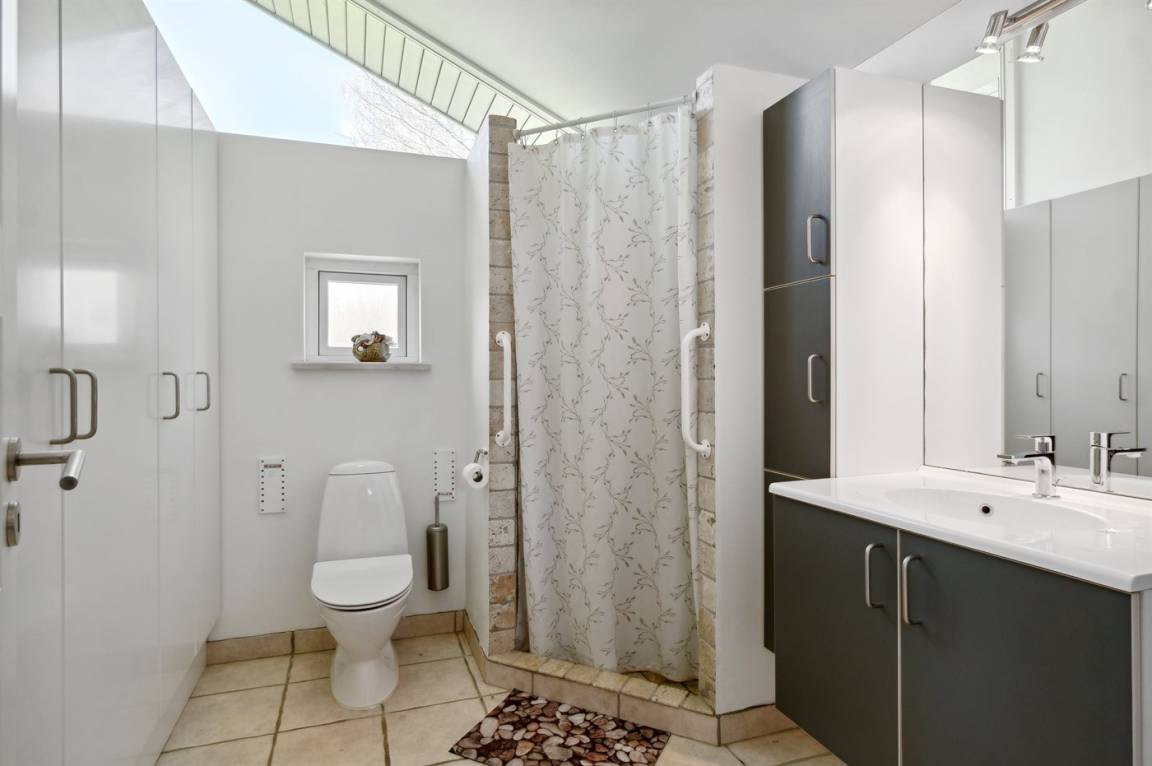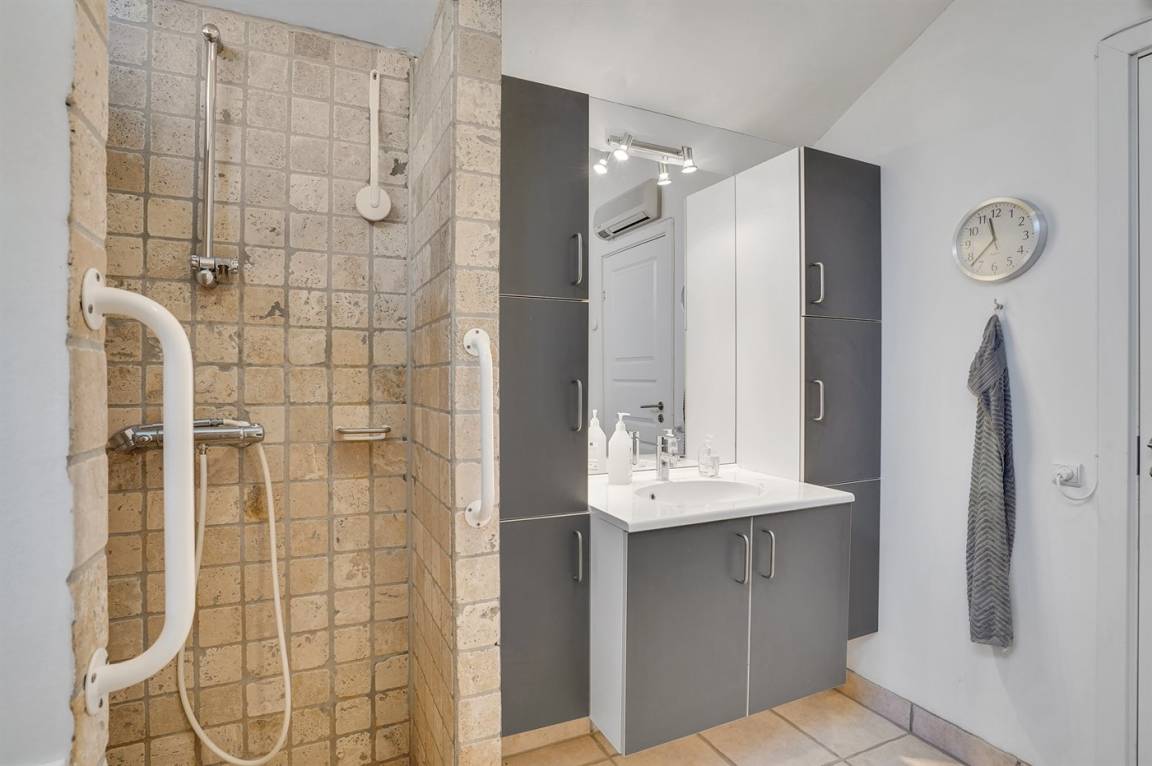 Das Badezimmer mit Duschnische und Fußbodenheizung ist groß und bietet viel Stauraum. Alle gefliesten Böden sind mit einer elektrischen Fußbodenheizung ausgestattet. Außerdem sind 2 Wärmepumpen vorhanden, eine davon mit Kühlfunktion.