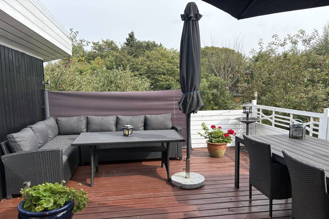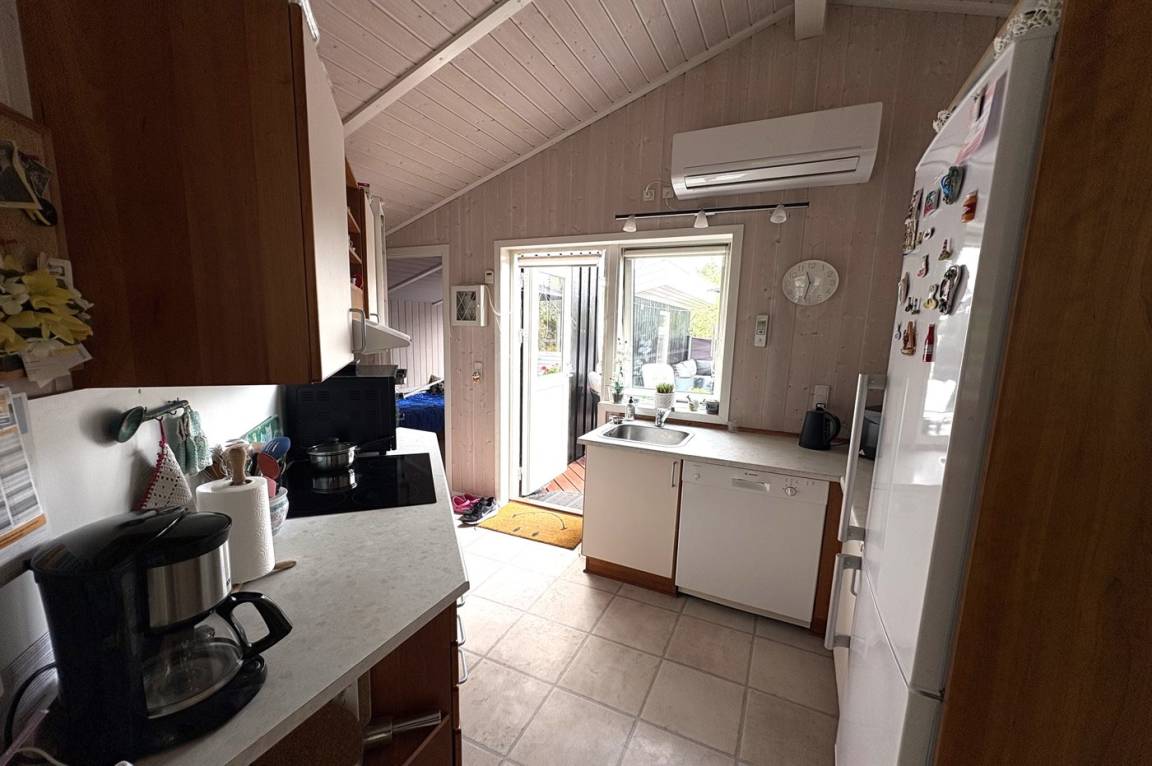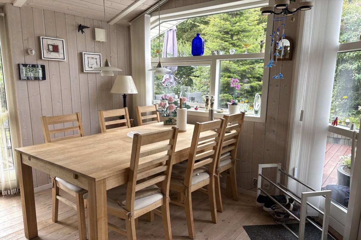 Das Haus ist mit einem gemütlichen Wohnzimmer mit Essplatz und Zugang zur Terrasse, die teilweise überdacht ist, eingerichtet. Von der Küche aus gelangst du auf eine weitere Terrasse mit Blick in den Garten.