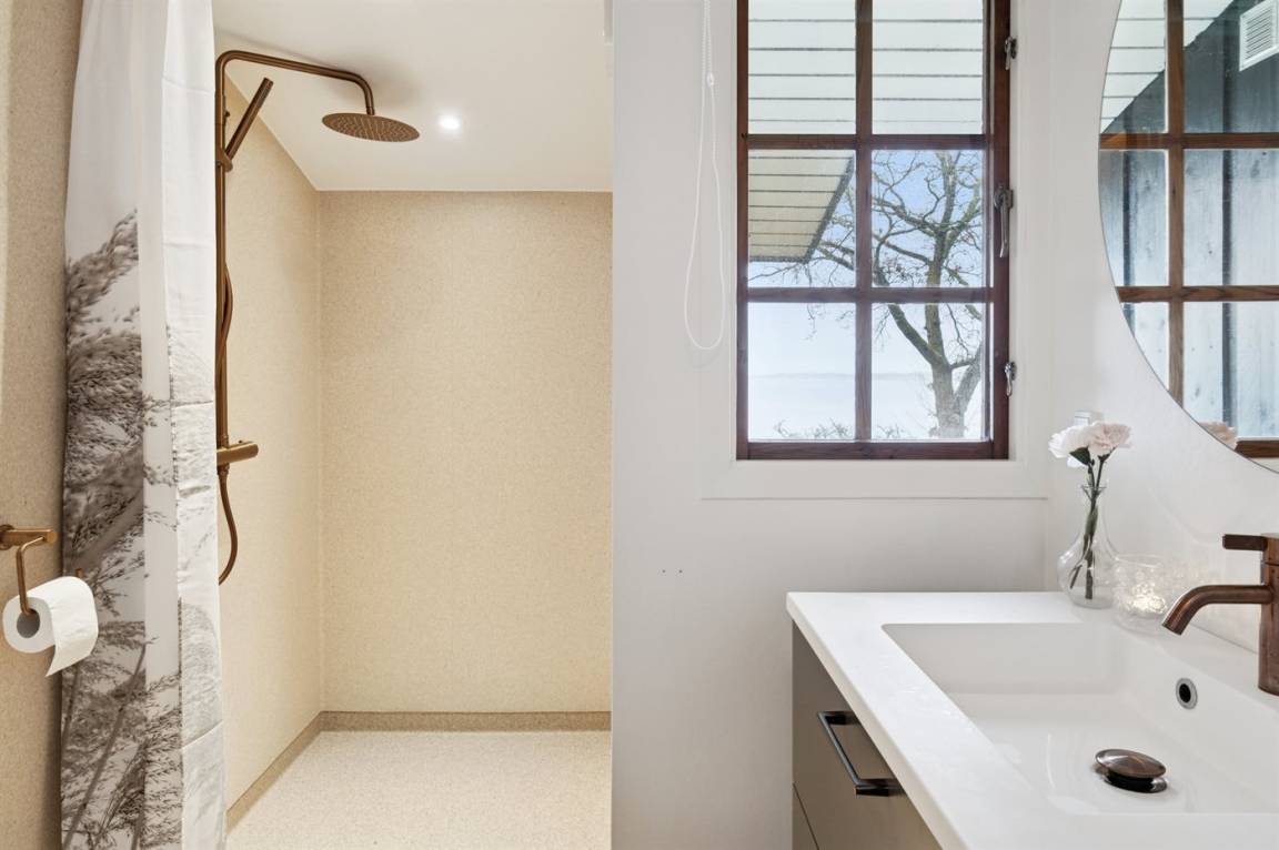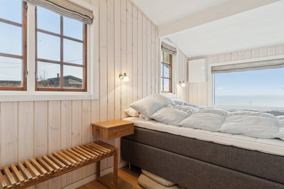 Es gibt 3 Schlafzimmer. Das Schlafzimmer mit Blick auf den Fjord ist mit einem Doppelbett ausgestattet und bietet die feine Aussicht auf den Fjord. Ein weiteres Zimmer verfügt ebenfalls über ein Doppelbett. Im dritten Schlafzimmer gibt es einen Einzelbett (dieses Bett misst 85x190 cm). Das Badezimmer ist mit einer Duschniche ausgestattet.