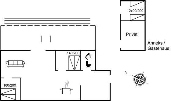 SchlafverhältnisseDie Schlafplätze verteilen sich auf 3 Schlafräume. 4 Schlafplätze in Doppelbetten. 2 Schlafplätze in Einzelbetten. 2 von diesen Schlafplätzen befinden sich im Gästehaus.