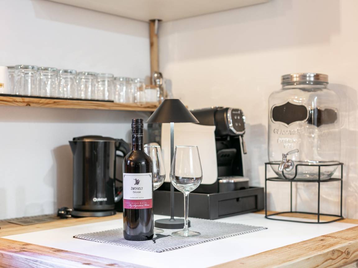 Layout : Parterre(privater Eingang): Eingang mit Sitzecke , Esszimmer mit Esstisch(4 Personen) , Küche mit Wasserkocher, Toaster, Kochherd, Dunstabzugshaube, Kaffeemaschine(Vollautomat, Bohnen), Backofen, Geschirrspüler, Kühlschrank(+ Gefrierfach), Tiefkühlschrank , Schlafzimmer mit Einzelbett, Doppelbett , Badezimmer mit Waschbecken, Dusche, Föhn , Toilette mit Waschbecken, Toilette, Waschmaschine , Saunaraum(alleinige Nutzung, von außen erreichbar) mit Sauna , Garten(Gemeinschaftliche Nutzung mit anderen Gästen, teilweise umzäunt, 20 m²) mit Terrasse