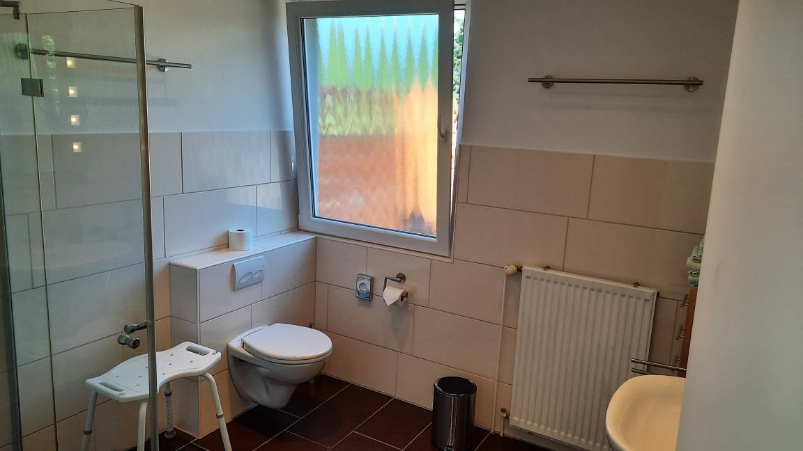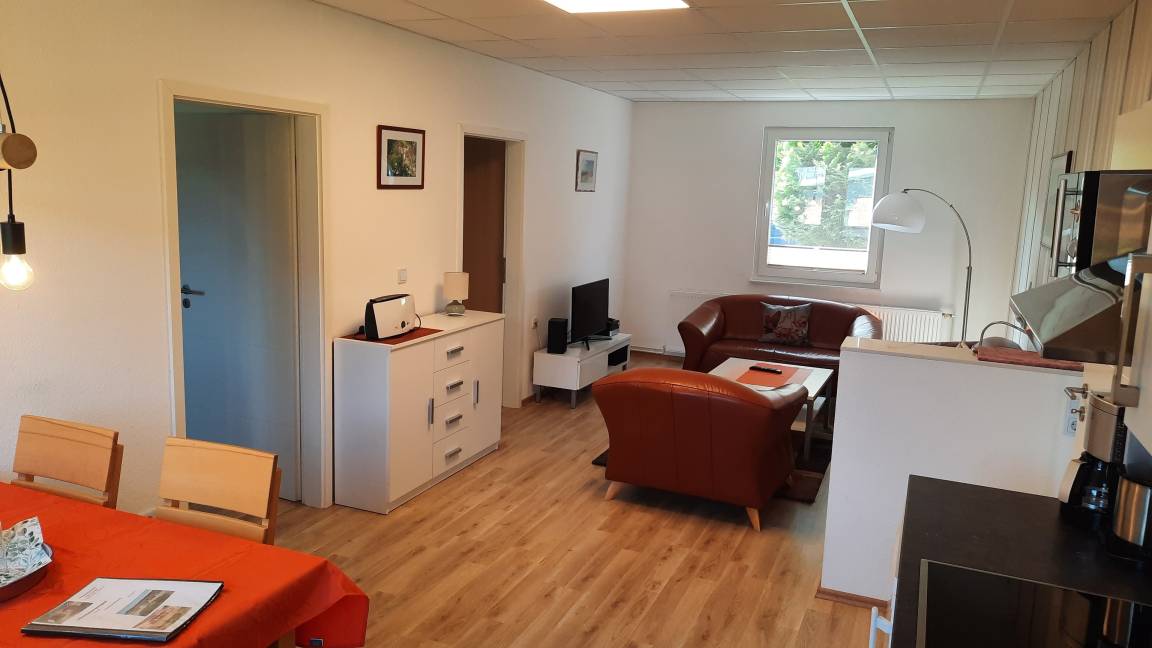 Die Ferienwohnung verfügt über zwei geräumige Schlafzimmer für vier Personen (ein Doppelbett und zwei Einzelbetten) und einen Hauptraum. Dieser unterteilt sich in einen Koch-/Essbereich mit vollwertiger Einbauküche und einen Wohnbereich mit bequemer Sitzecke und Fernseher. Die Wohnung ist ebenerdig und hat einen großen Vorflur. Für Fahrräder steht je Ferienwohnung ein separater abschließbarer Abstellraum zur Verfügung.