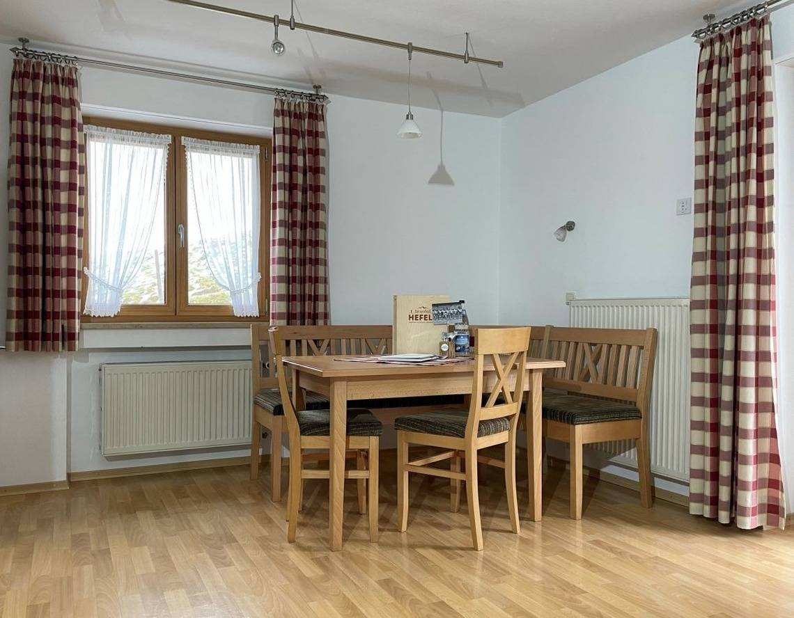 Wohnung "Hopfensee", ca. 56 m², ebenerdig mit Terrasse, kleiner Gartenanteil, ausgerichtet nach Süden, mit Garten- und Hofblick, allergikerfreundlich, großzügige Wohnküche mit Couch, Sat-TV und Stereoanlage.