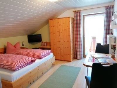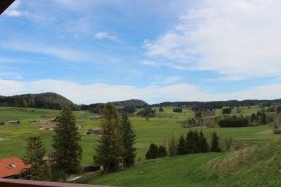 Unser Gästezimmer Alpsee (18 qm) mit Balkon liegt im 2. Stock und punktet mit einem Weitblick ins Grüne.