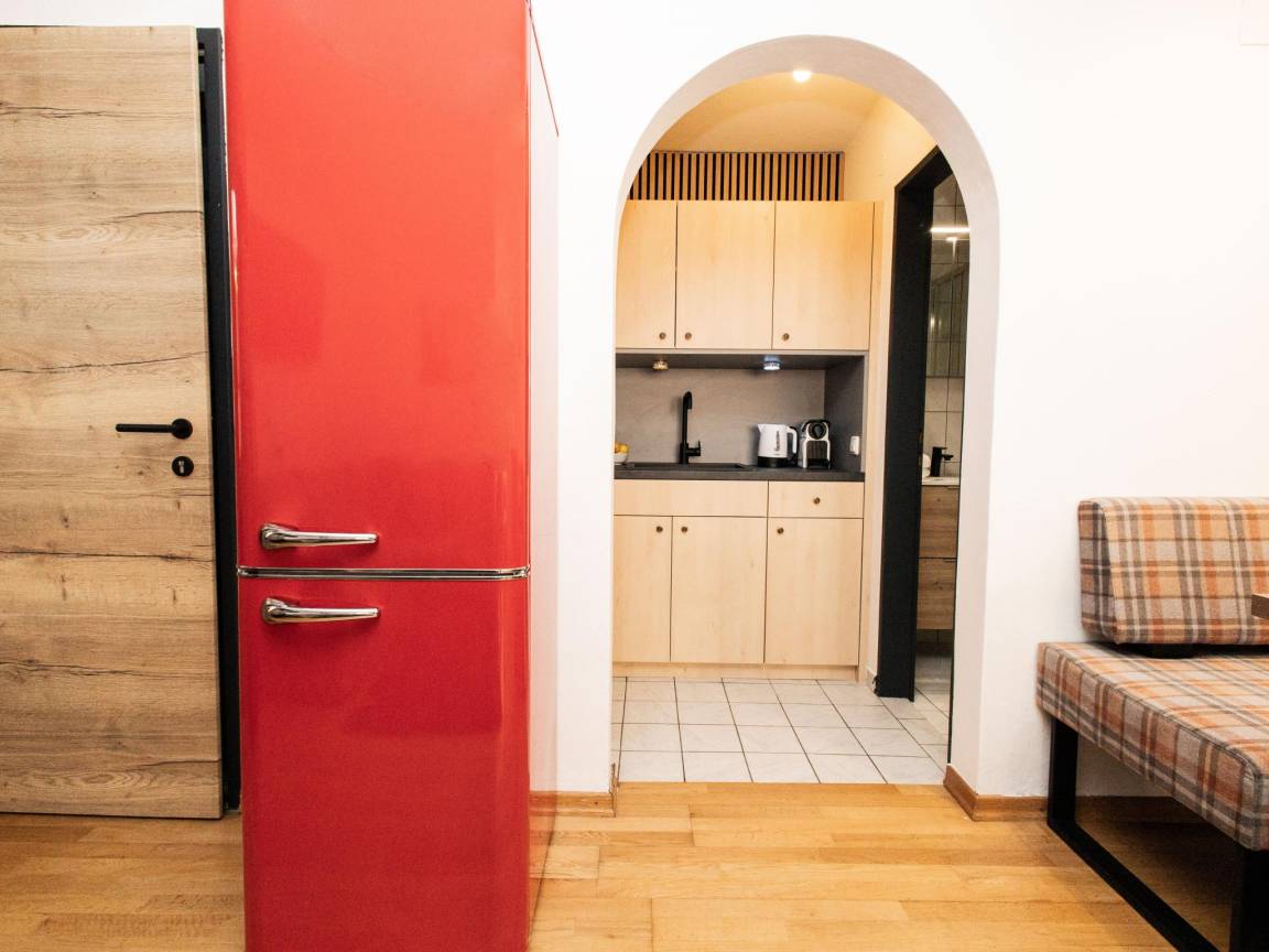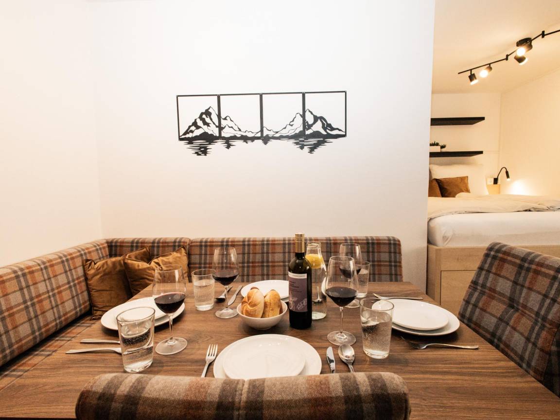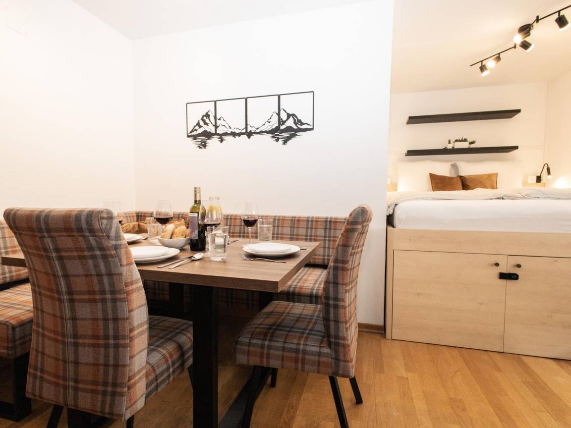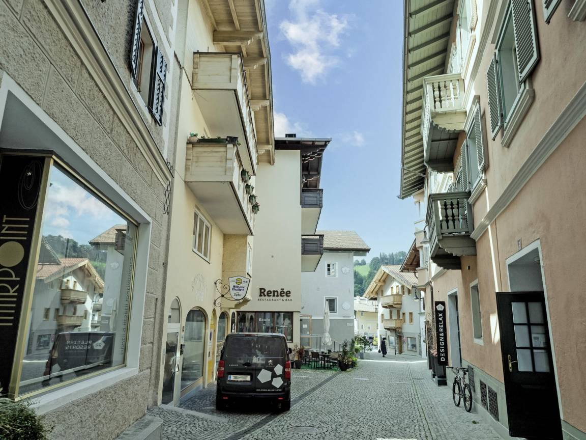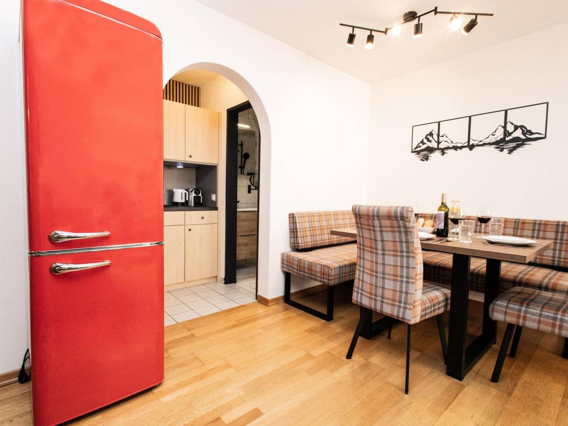 Hausbeschreibung : Stilvolles Apartment im Zentrum von Hopfgarten - Nur 4 Gehminuten von der Talstation der Bergbahn entfernt, ist dieses moderne Apartment der ideale Ausgangspunkt für Ihre Urlaubsabenteuer. Die Ferienwohnung bietet ein gemütliches Wohn-Schlafzimmer ideal für 2 Erwachsene (Doppelbett), bietet aber ebenso Platz für 3 Erwachsene (mit Schlafcouch) oder 2 Erwachsene mit 2 Kindern. Zudem verfügt sie über eine kleine Küche und ein modernes Bad. Der Bahnhof ist nur 250 m entfernt