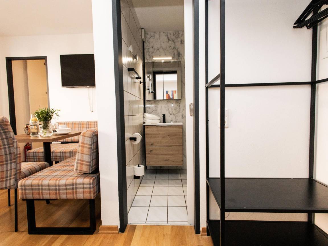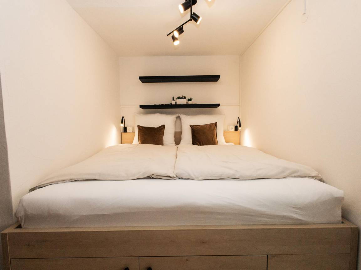 Layout : Gästeunterkunft in der 1. Etage: Eingang, Küche mit Wasserkocher, Toaster, Kochherd(2 Kochplatten, Ceranfeld, elektrisch), Kaffeemaschine(nespresso cups), Backofen, Kühl-/Gefrierkombination , Wohn-/Schlafzimmer mit Doppelbett(180 x 200 cm), Doppelschlafcouch, TV(Flatscreen), Esstisch(4 Personen), Sitzecke , Badezimmer mit Waschbecken, Dusche, Toilette, Föhn
