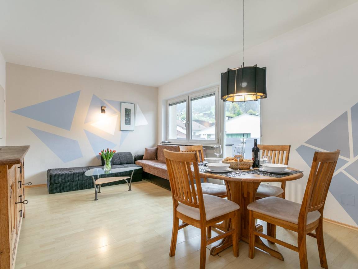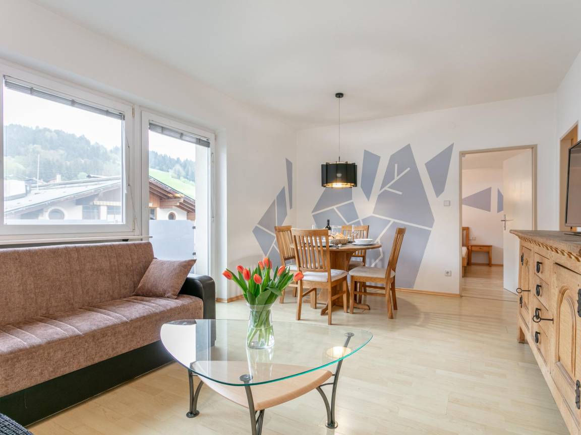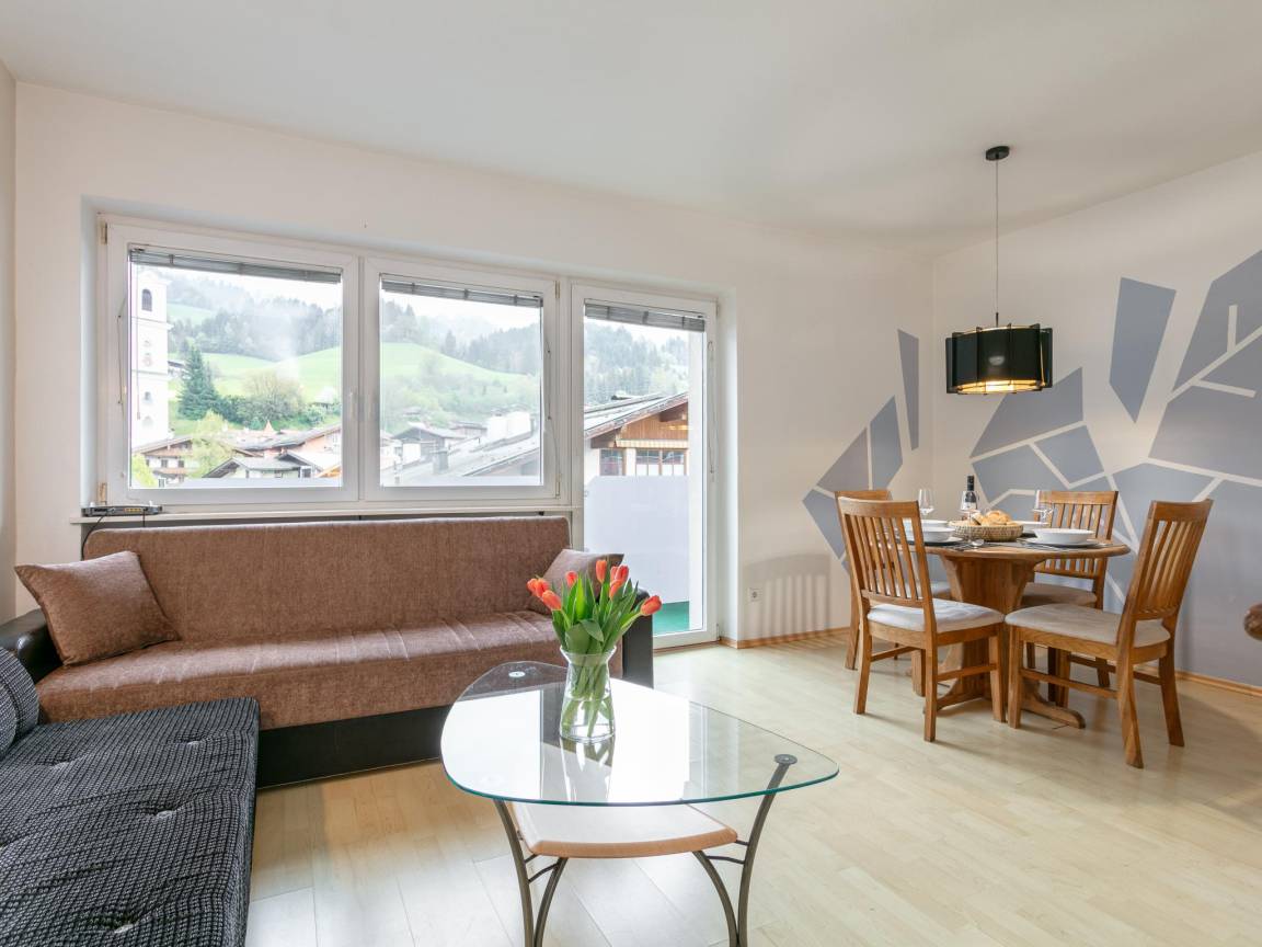 Hausbeschreibung : Das gemütliche Dachgeschoss-Appartement bietet ein geräumiges Durchgangsschlafzimmer, ein Hinterzimmer, sowie ein Wohn-/Esszimmer mit Doppelschlafcouch – perfekt für kleine Familien. Highlight ist das moderne Bad und die voll ausgestattete Küche. Der Balkon bietet malerische Ausblicke auf die Hohe Salve und Hopfgarten und durch die zentrale Lage sind Shops, Restaurants, Skilifte, Bäckerei uvm nur einen Steinwurf von der Unterkunft entfernt. Ideal für einen unvergesslichen Aufenthalt