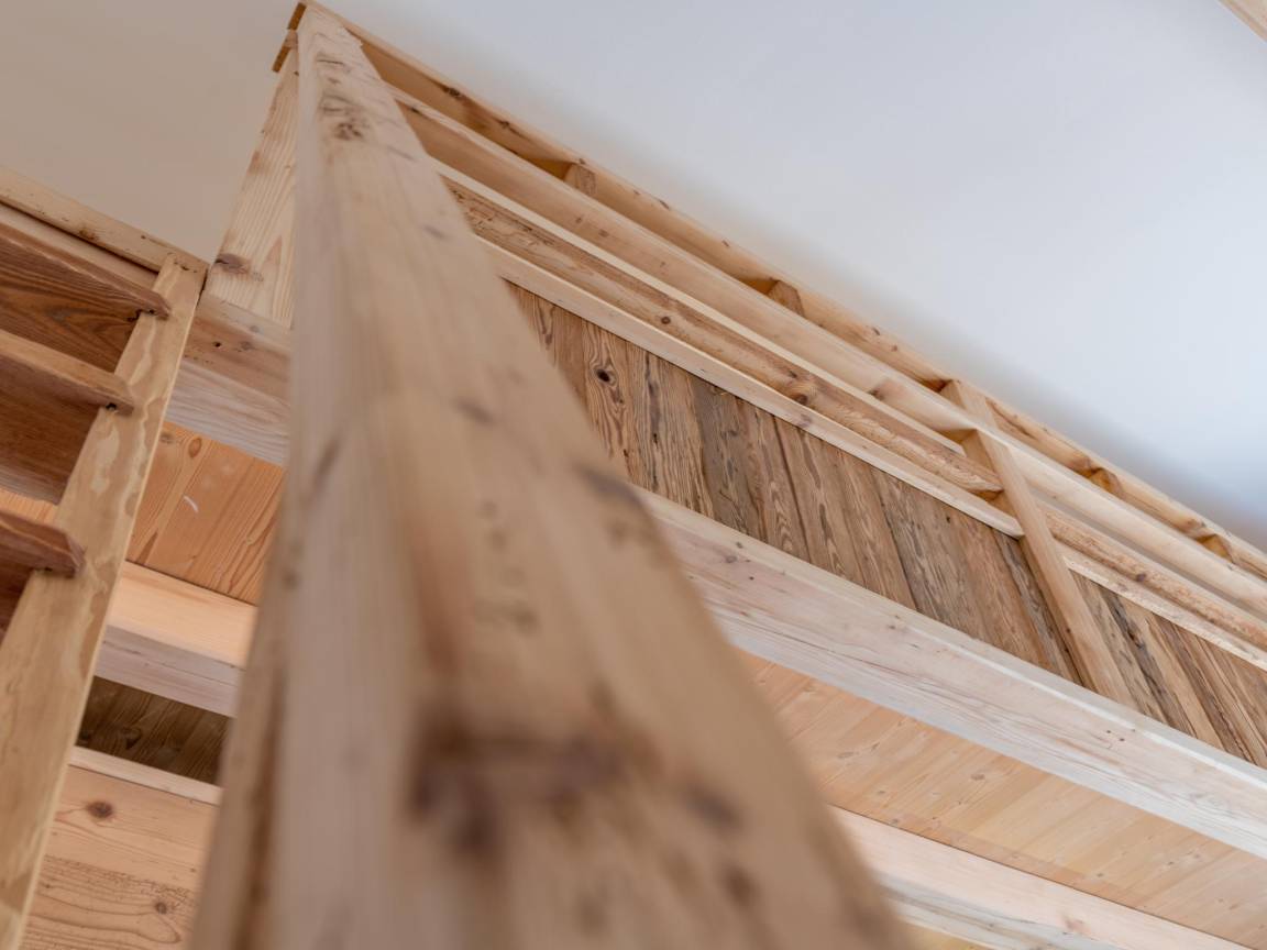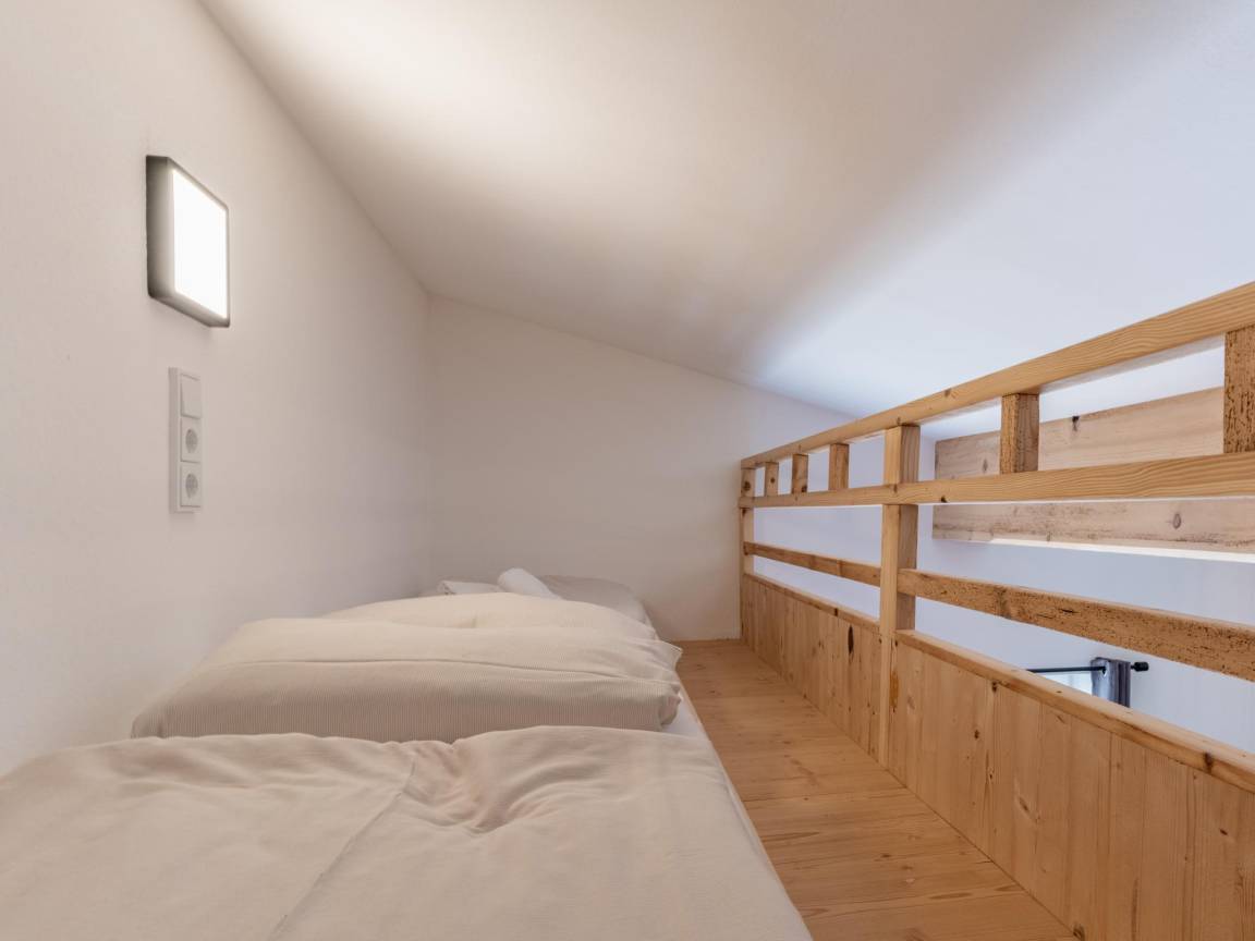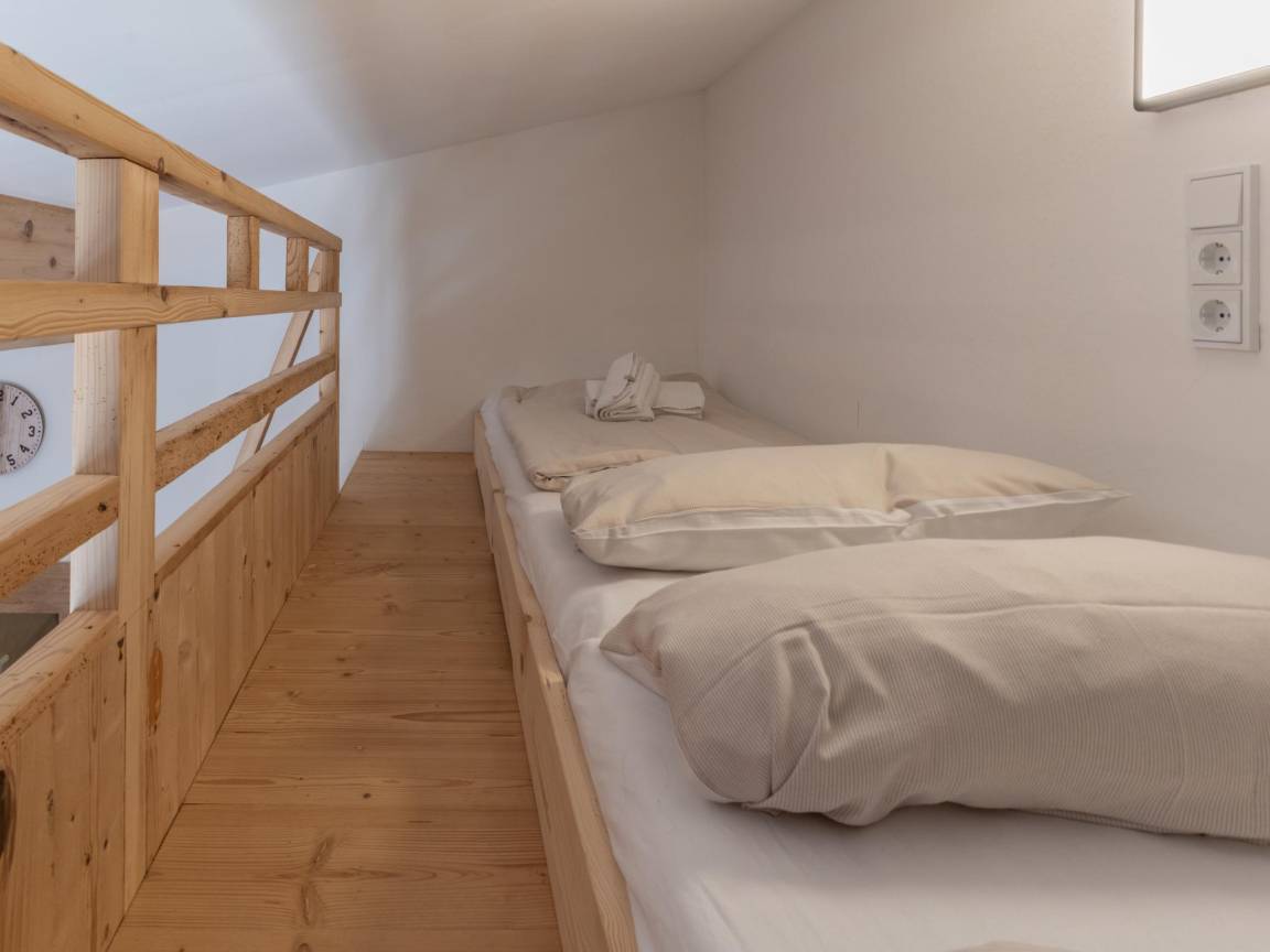 Layout : In der 2. Etage: Küche mit Wasserkocher, Toaster, Kochherd(2 Kochplatten), Kaffeemaschine(cups), Backofen, Kühlschrank , Wohn-/Schlafzimmer mit 2x Einzelbett(Empore), Doppelbett, TV, Esstisch, Sitzecke , Badezimmer mit Dusche, Waschbecken, Toilette, Föhn , Balkon
