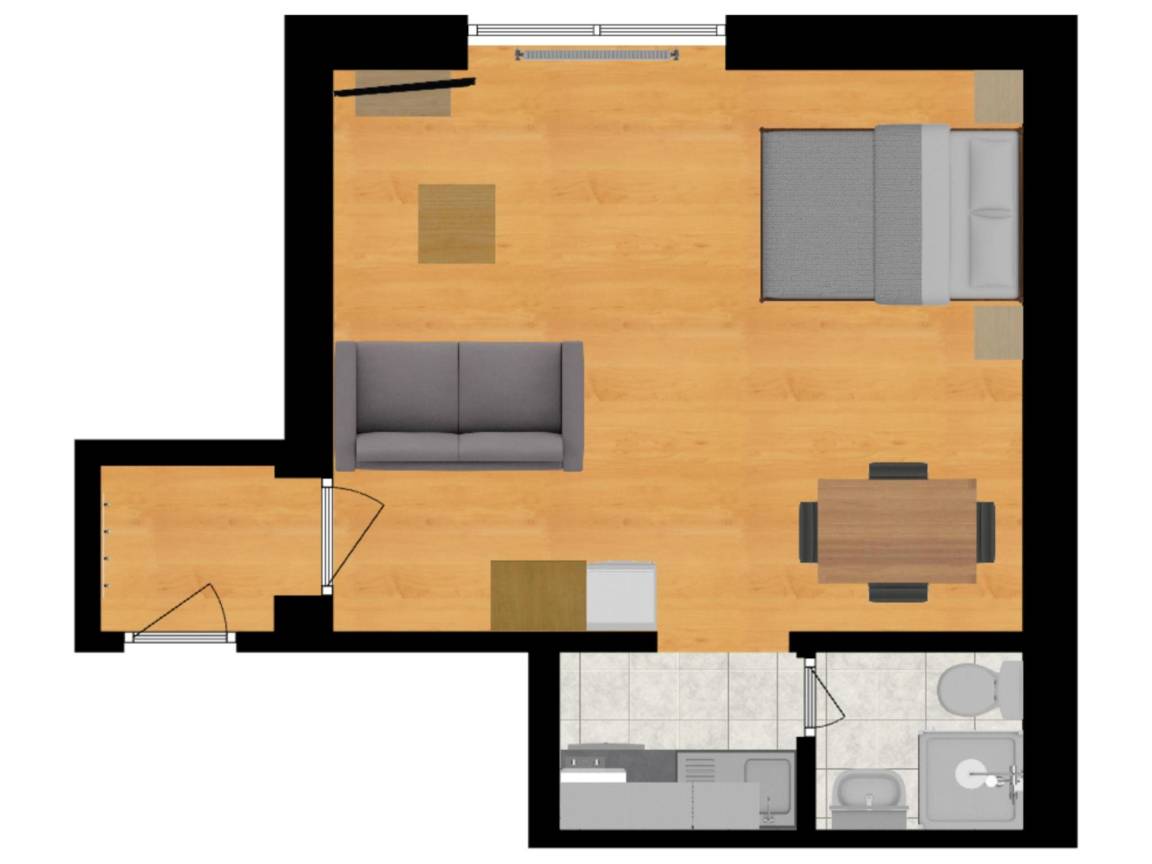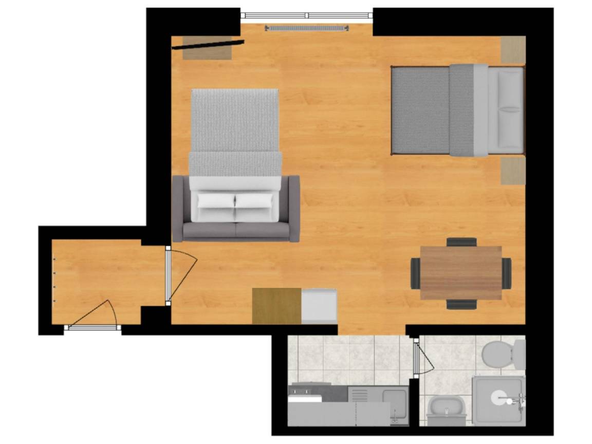 Layout : In der 1. Etage: offene Küche mit Wasserkocher, Toaster, Kochherd(2 Kochplatten, Ceranfeld), Dunstabzugshaube, Kombi-Mikrowelle, Kühlschrank(+ Gefrierfach) , Wohn-/Schlafzimmer mit Doppelbett(140 x 200 cm), Doppelschlafcouch(140 x 200 cm), TV, Esstisch(4 Personen) , Badezimmer mit Dusche, Waschbecken, Toilette , Skiabstellraum