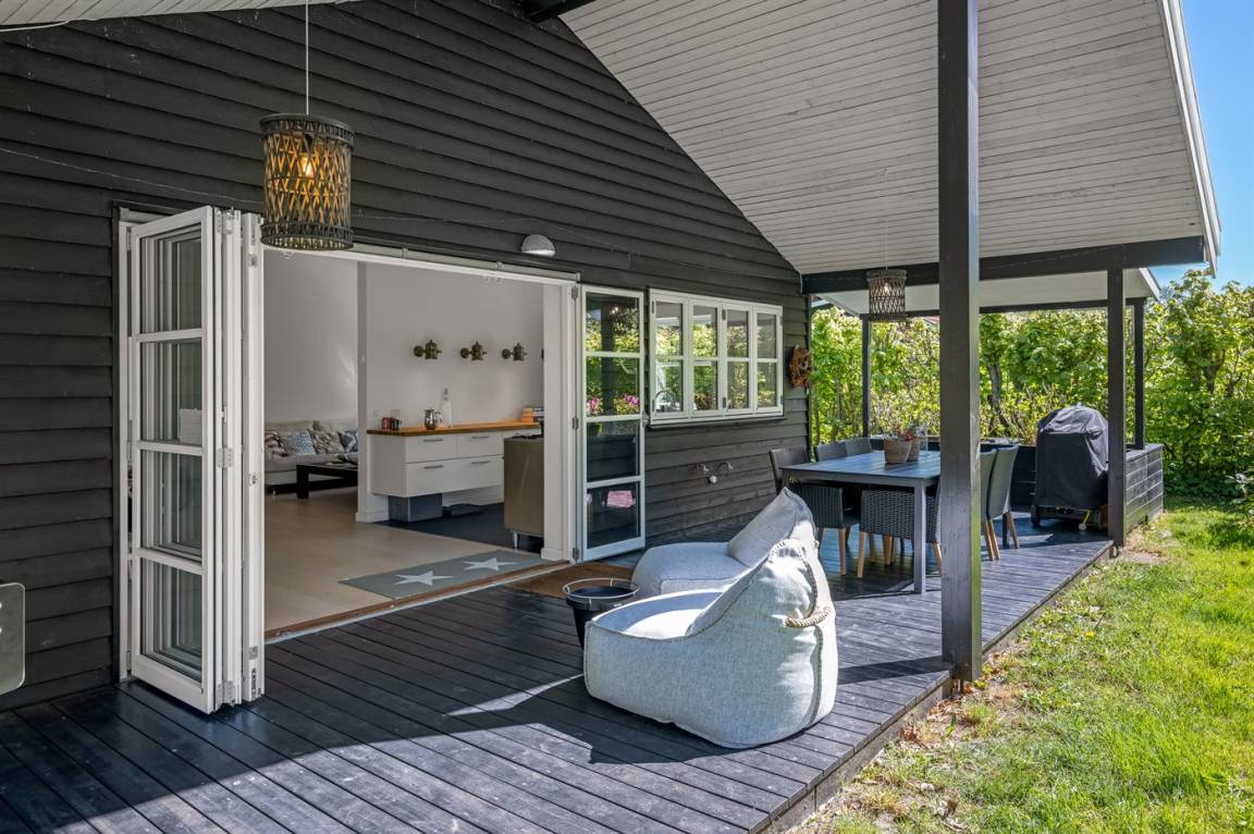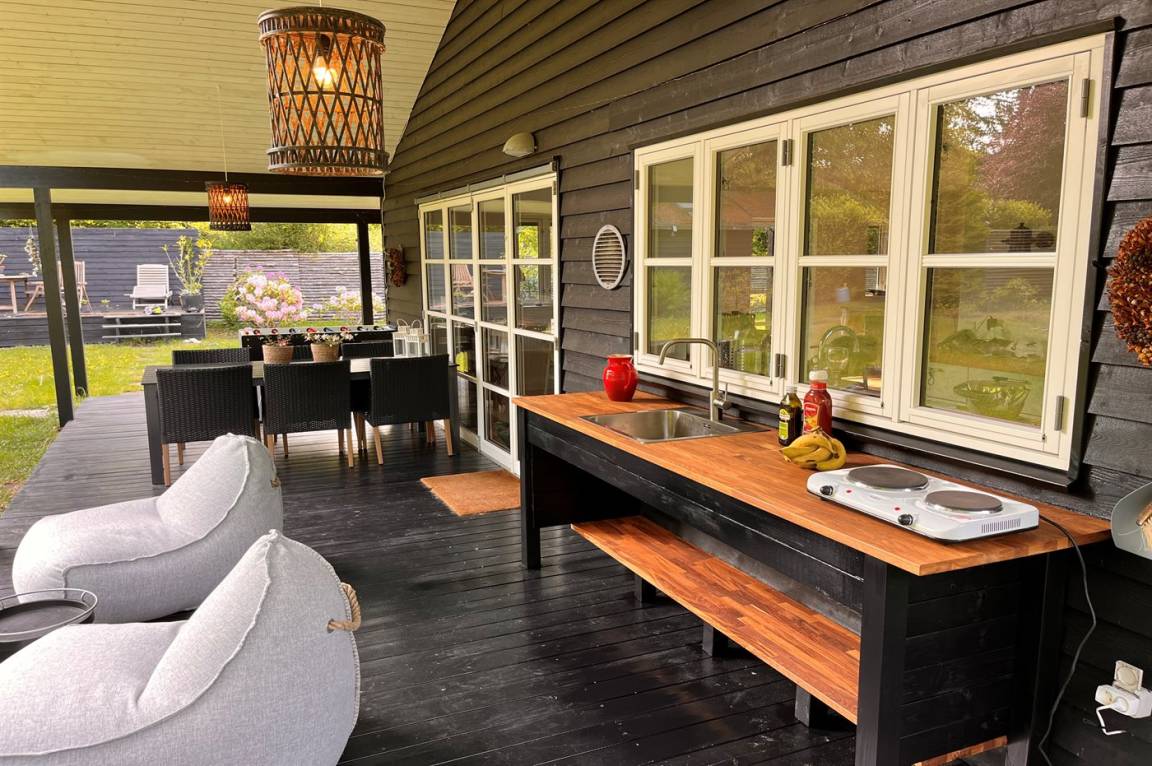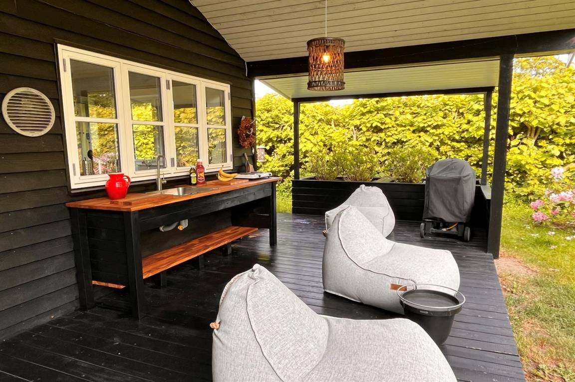 DraußenDie Ferienunterkunft liegt auf einem 1380 m² großen Gartengrundstück. Die Entfernung zum Meer beträgt 275 m. Die nächste Einkaufsmöglichkeit liegt 200 m entfernt. Es steht ein offenes Terrassenareal zur Verfügung. Außerdem gibt es überdachte Terrasse. Trampolin. Außendusche. Es beteht die Möglichkeit das Essen in der Außenküche zuzubereiten. Es steht ein Grill zur Verfügung. Parkplatz auf dem Grundstück.