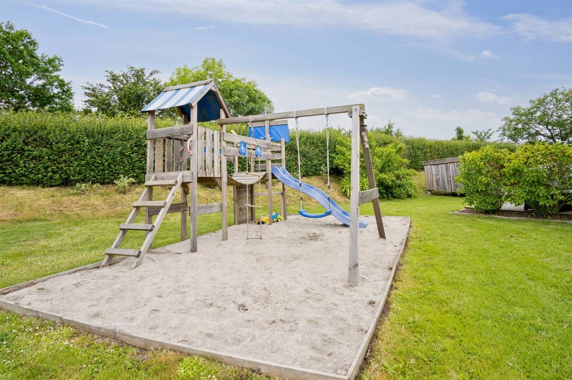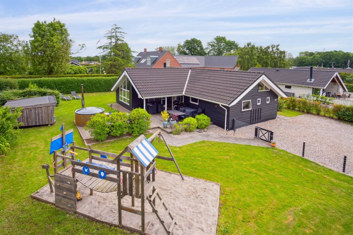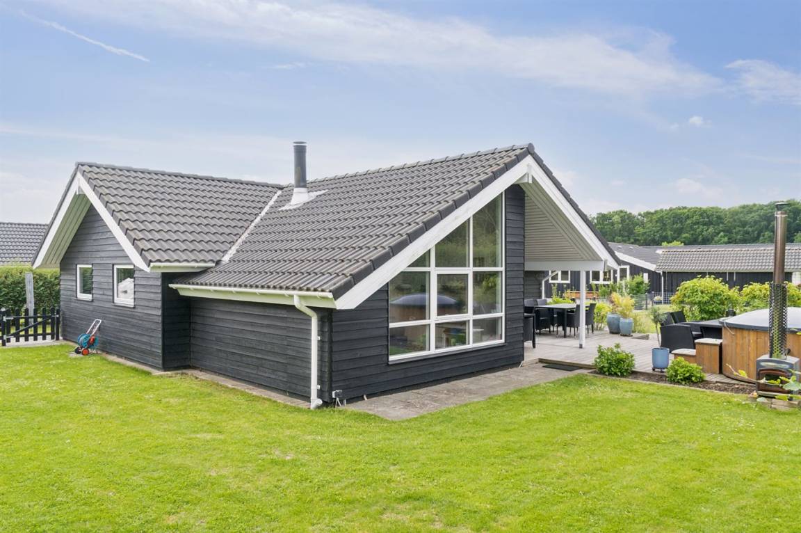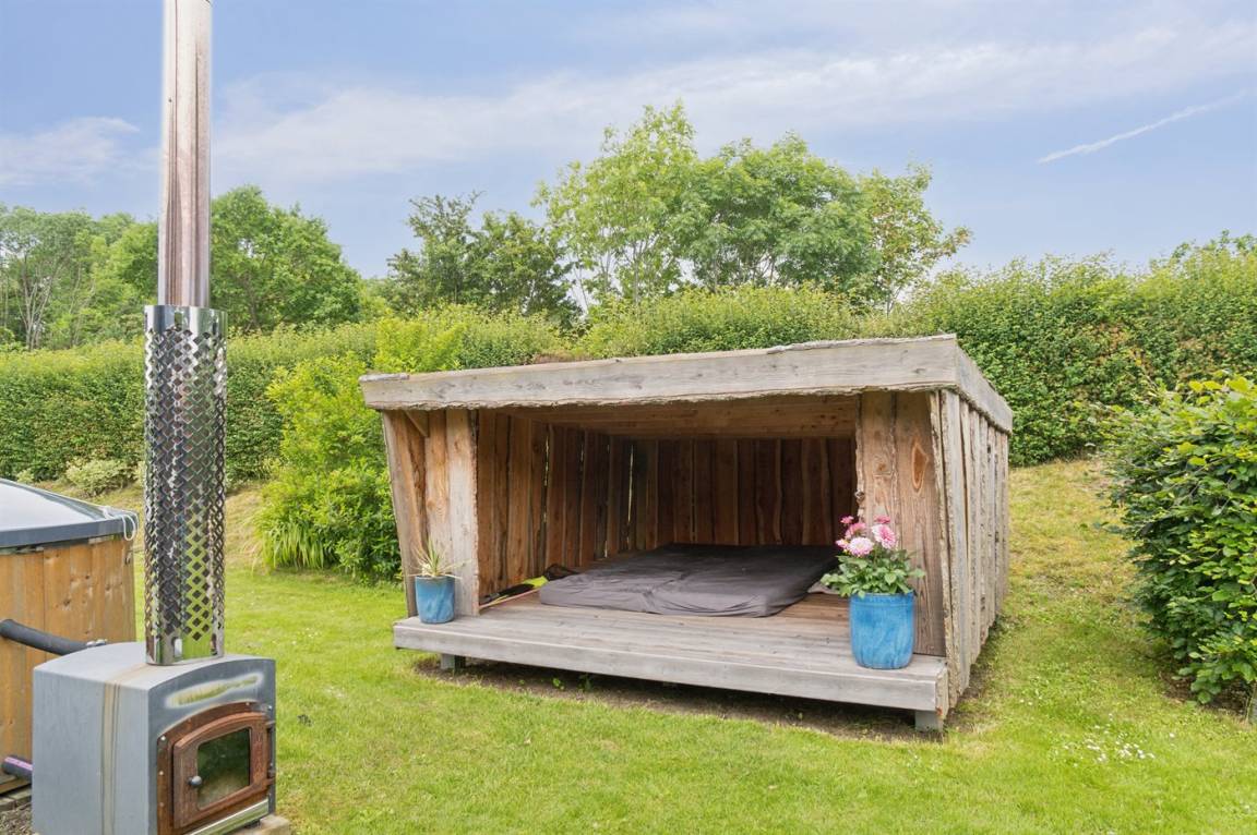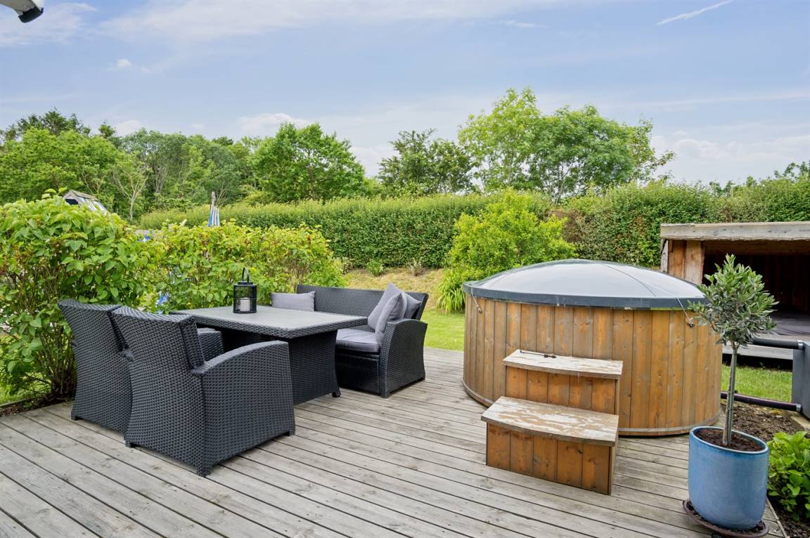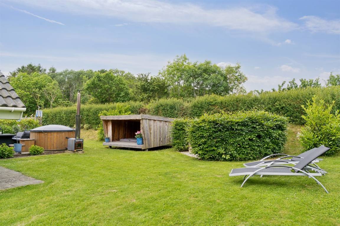 Das Ferienhaus liegt völlig ungestört und verfügt über einen schönen Garten mit unter anderem einem gemütlichen Lagerfeuerplatz, Spielmöglichkeiten und nicht zuletzt einem Whirlpool auf der Terrasse, auf dem die ganze Familie sich entspannen und den Urlaub genießen kann. Das Ferienhaus bietet feine Terrassenbereiche, die teilweise überdacht sind, so dass es immer möglich ist, eine windgeschützte Ecke zu finden, um die Sonne zu genießen.