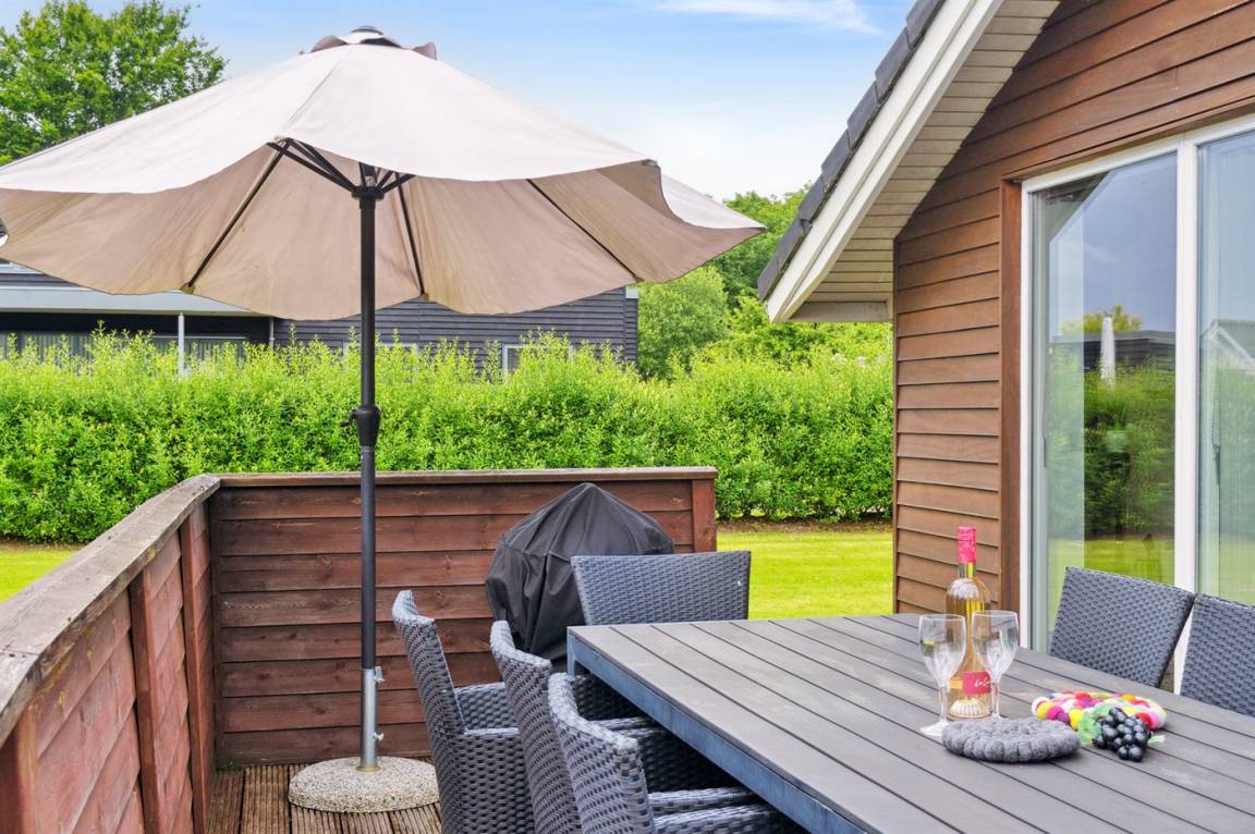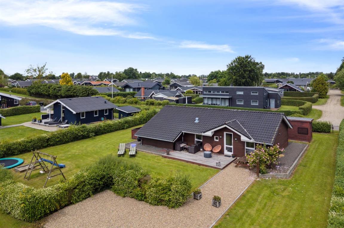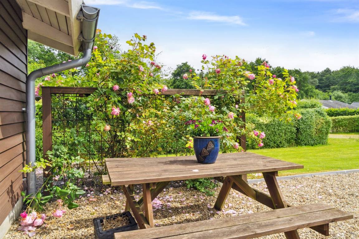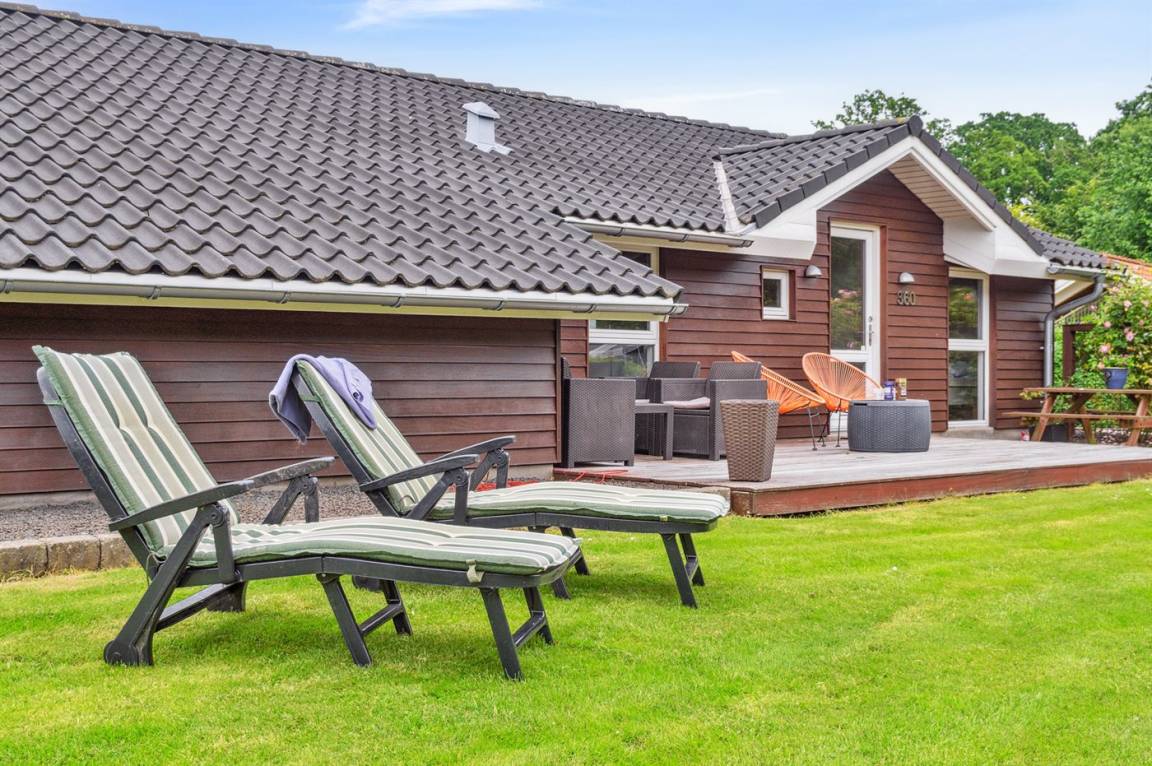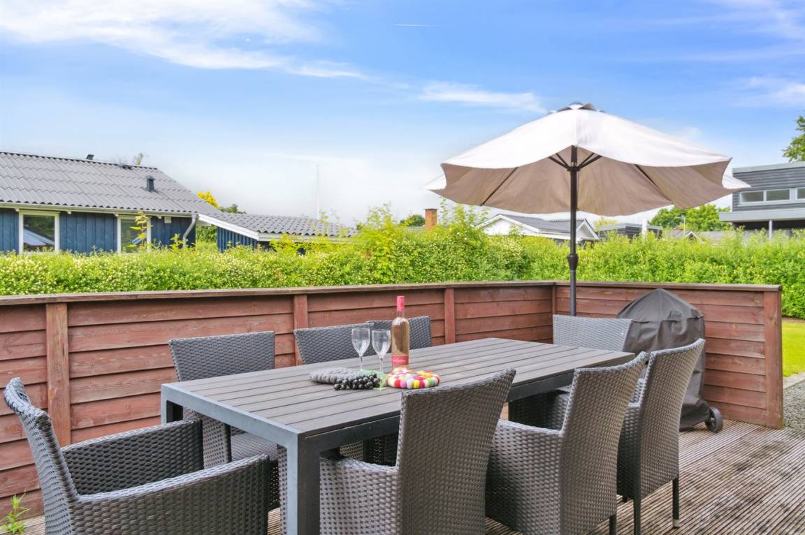 Das Ferienhaus liegt auf einem wirklich schönen Grundstück mit einem herrlichen Garten, der sich hervorragend zum Spielen und Ballspielen eignet. Darüber hinaus gibt es verschiedene Spielmöglichkeiten wie z.B. ein Trampolin und einen Sandkasten u.a. Das Ferienhaus bietet schöne Terrassenbereiche, die sich an allen Seiten des Hauses befinden, sodass es immer möglich ist, ein windgeschütztes Plätzchen zu finden, wo man die Sonne genießen und mit einem Glas Wein oder einer Tasse Kaffee die friedliche und naturschöne Umgebung genießen kann.
